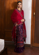 A vision in purple,this ensemble is adorned with intricate multi-colored embellishments,each stitch a testament to timeless craftsmanship and bold beauty.The regal charm of the chooridar sleeves elevates the look,while the contrasting vivid hue karandi shawl adds a striking pop of color. The delicately embroidered karandi fabric comes to life with detailed motifs and borders,each element thoughtfully designed to captivate and inspire admiration.
