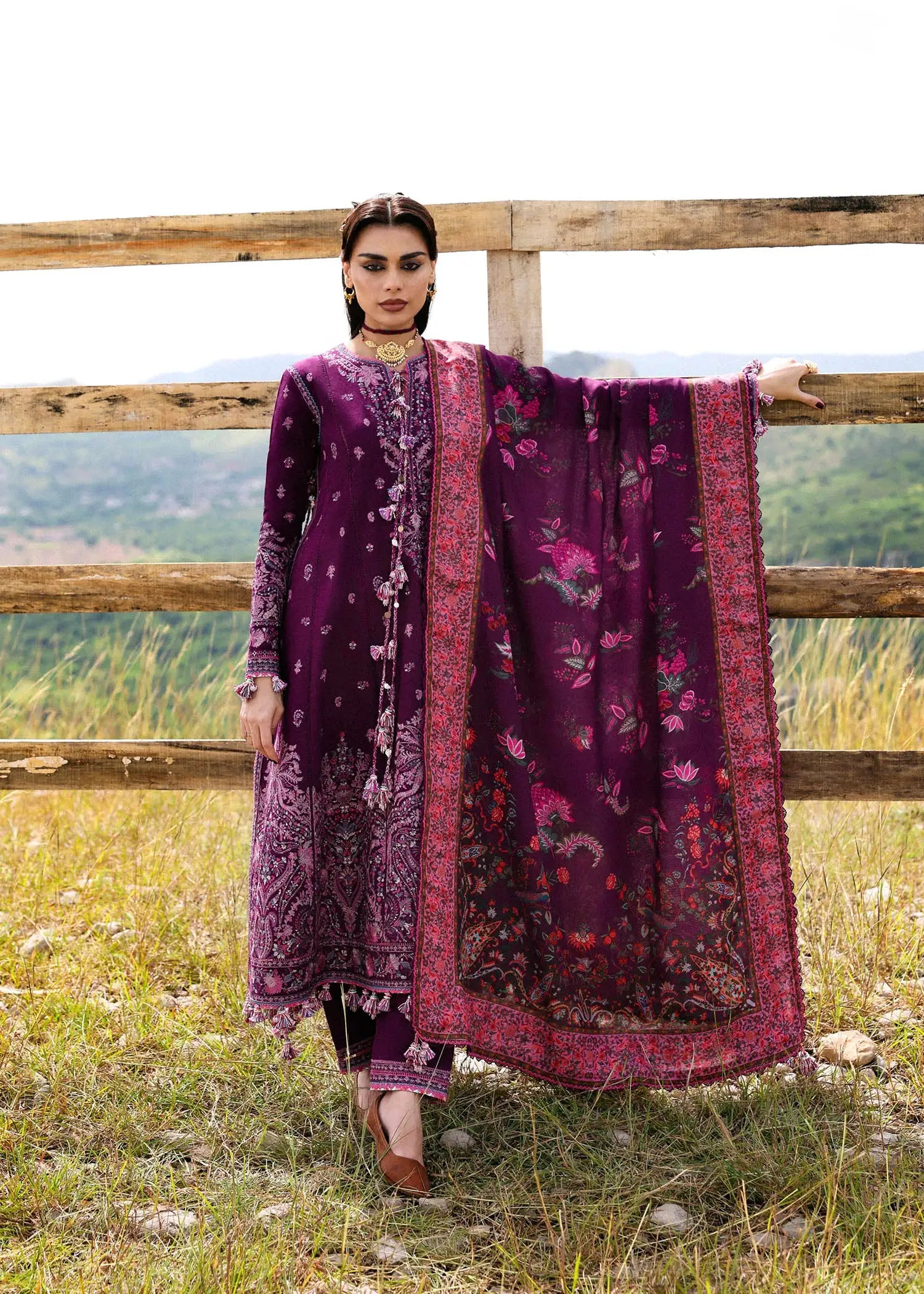 Step into winter grace with this purple long paneled flared khaddar shirt, exquisitely adorned with Kashmiri stitch embroidery and a heavily embroidered hem inspired by timeless Kashmiri motifs. The delicate boti spray across the panels and intricately embroidered gathered sleeves exude refined charm. Paired with a traditional shalwar featuring embroidered borders, and a matching printed wool shawl framed in soft lavender tones, this ensemble beautifully blends warmth, heritage, and sophistication.