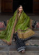 A beautiful olive green lawn shirt serves as the base of the outfit. The shirt is heavily adorned with white and monotone embroidery on the front and sleeves, adding a touch of elegance. A black dyed shalwar with an embroidered border complements the shirt perfectly. A stunning olive green organza dupatta with embroidery adds a pop of color and completes the outfit. The heavy embroidery on the shirt and shalwar adds a level of sophistication and intricacy.