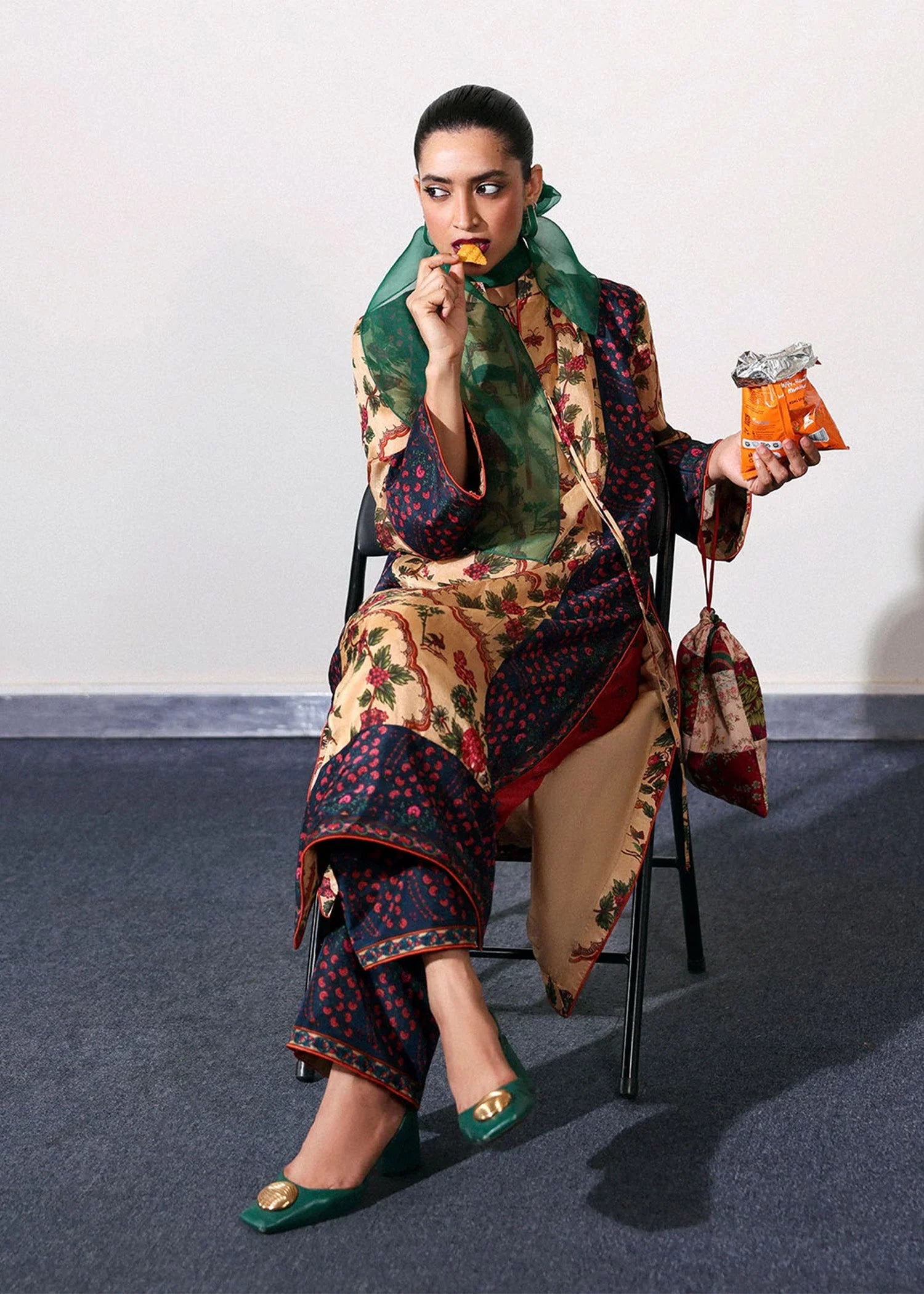A light camel floral printed long shirt framed with blue floral borders on all sides, featuring a gathered neckline and printed silk tassel. Paired with straight, ankle-length red pants finished with blue border detailing.