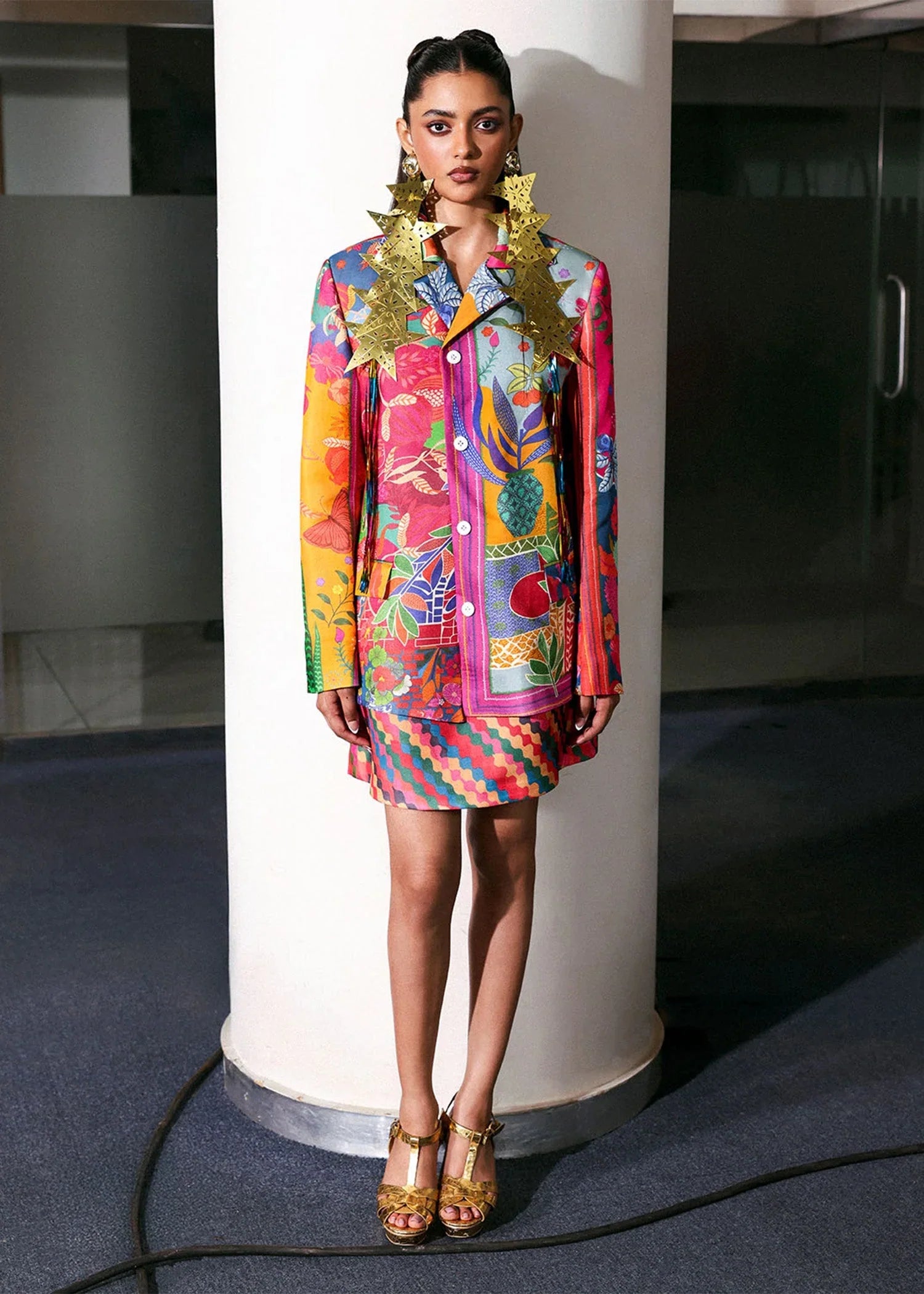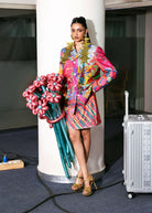 A bold, collage-style printed silk jacket featuring a tailored silhouette with sharp lapels, structured shoulders, and vibrant multicolored panels. Crafted in textured silk with button-down detailing, the piece merges graphic florals, checkered waves, and geometric motifs. It is paired up with a multicolored mini skirt for a playful look.