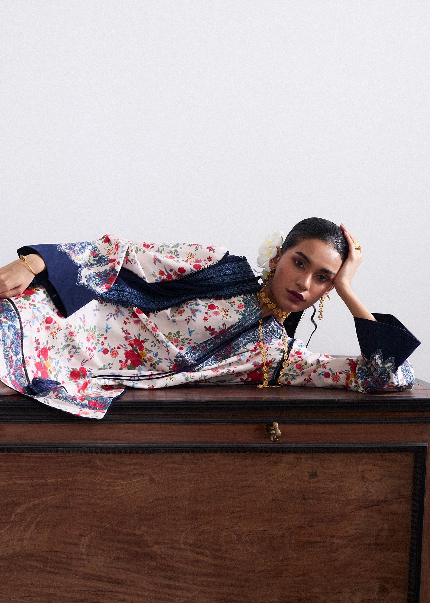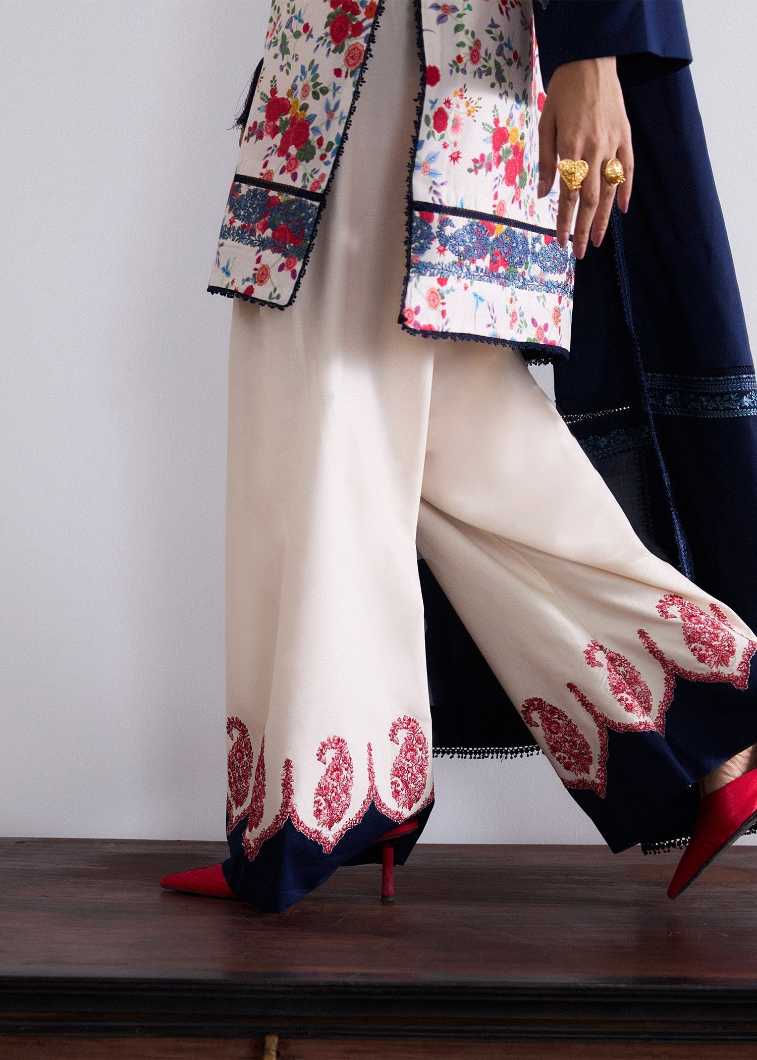 Make a statement this summer with our ivory printed lawn outfit, beautifully accented with navy blue embroidery on the shirt and vibrant red embroidery on the shalwar. A bold blue color block adds a touch of contemporary flair. Paired with a lightweight lawn dupatta featuring sleek embroidered borders, this ensemble blends tradition with trend. Perfectly breezy and stylish for warm-weather days.