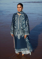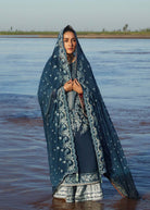 A long, straight-cut shirt with intricate white floral embroidery covering the front, neckline, and sleeves. The neckline features detailed embellishments, and the border has a delicate lace finish. A matching screen print shalwar creates traditional look also complementing the design of the shirt. Same navy blue chiffon dupatta adorned with embroidered floral motifs and an elegant lace border, finished with decorative tassels on the corners. The outfit is a great choice for festive occasions, or cultural celebrations.