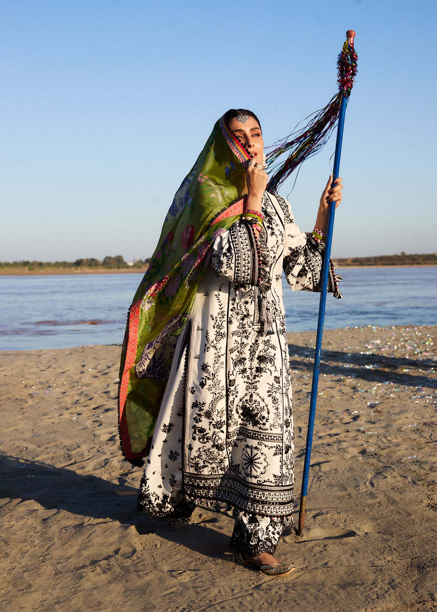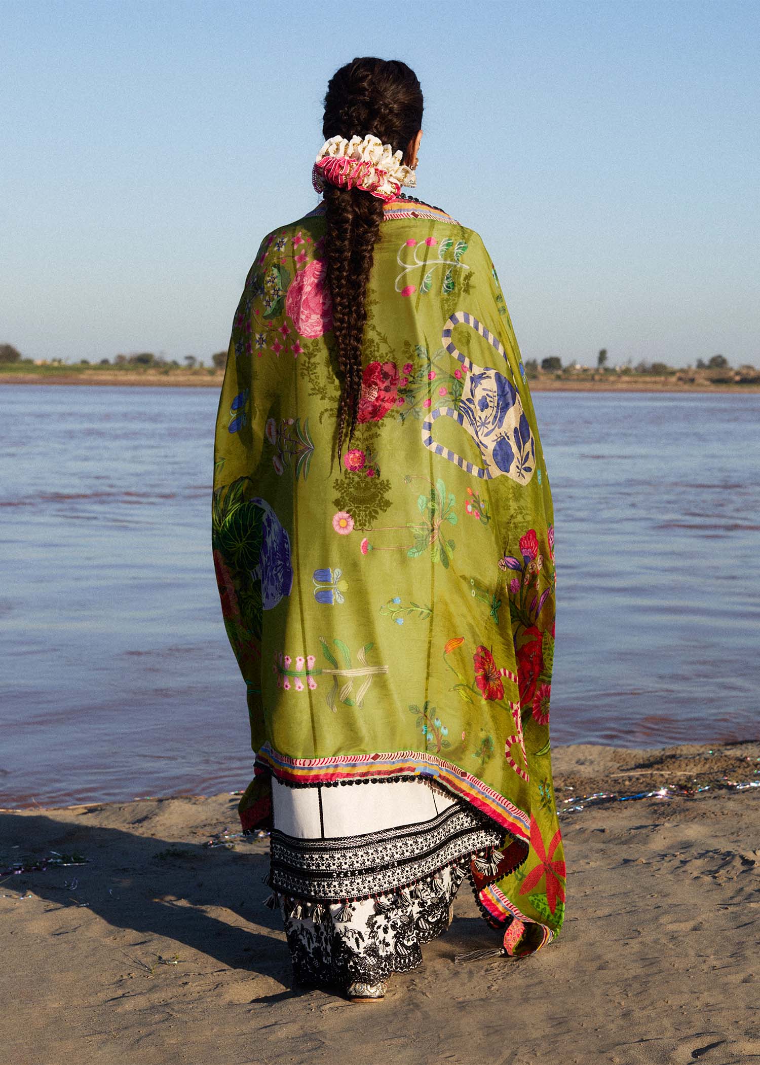This elegant white embroidered shirt is a perfect blend of traditional craftsmanship and modern aesthetics. The shirt features intricate black floral embroidery spread across the entire fabric, giving it a sophisticated and timeless look. The neckline is adorned with delicate tassel detailing, adding a touch of grace. The sleeves and hemline are beautifully decorated with embroidered borders and tassels, enhancing its overall charm. Same embroidery on trouser bottom create a modern look. Paired with this outfit is a vibrant silk dupatta in a contrasting green shade, adorned with colorful floral Digital print. The dupatta adds a striking pop of color, making the ensemble perfect for festive occasions, cultural events, or formal gatherings.