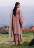 Shireen in Coral Pink/Beige from our Winterkari '25 Collection. An embroidered khaddar 3pc unstitched outfit paired with khaddar trousers & an acrylic shawl.