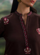Zerreen in Dark Brown from our Winterkari '25 Collection. An embroidered khaddar 3pc unstitched outfit paired with khaddar trousers & an acrylic shawl.