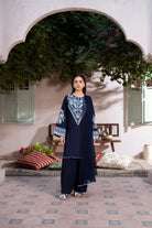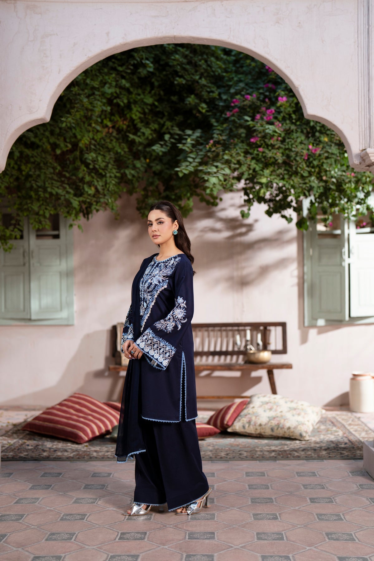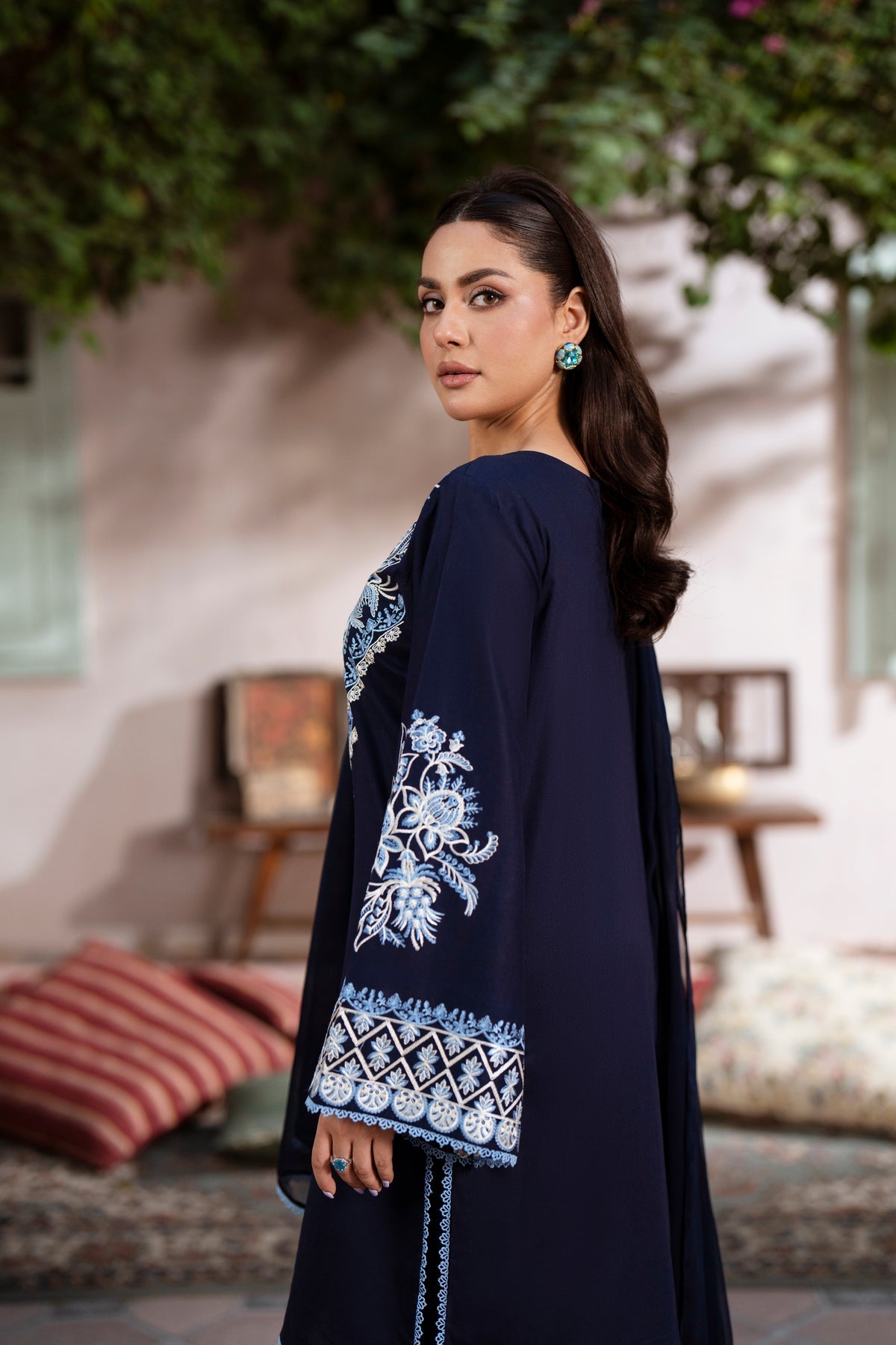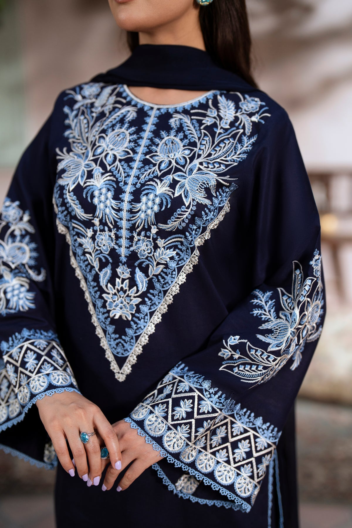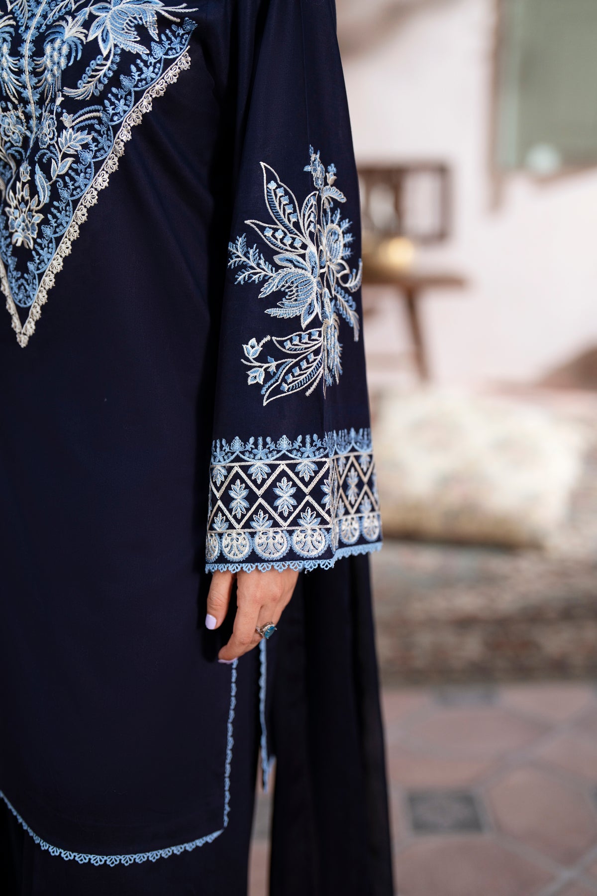A deep navy-blue premium quality lawn ensemble featuring a rich embroidery neckline & sleeves adorned with Farshi Shalwar to complete the comfy style.