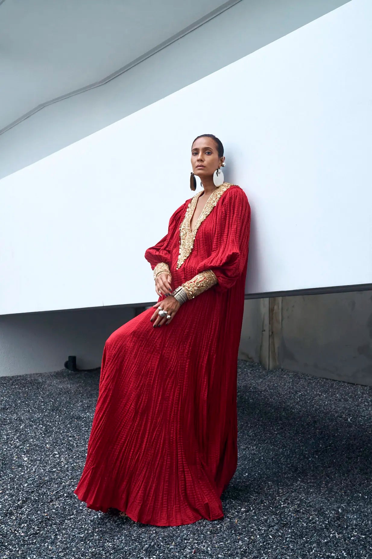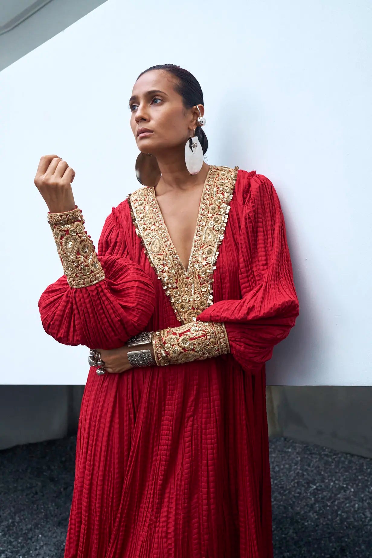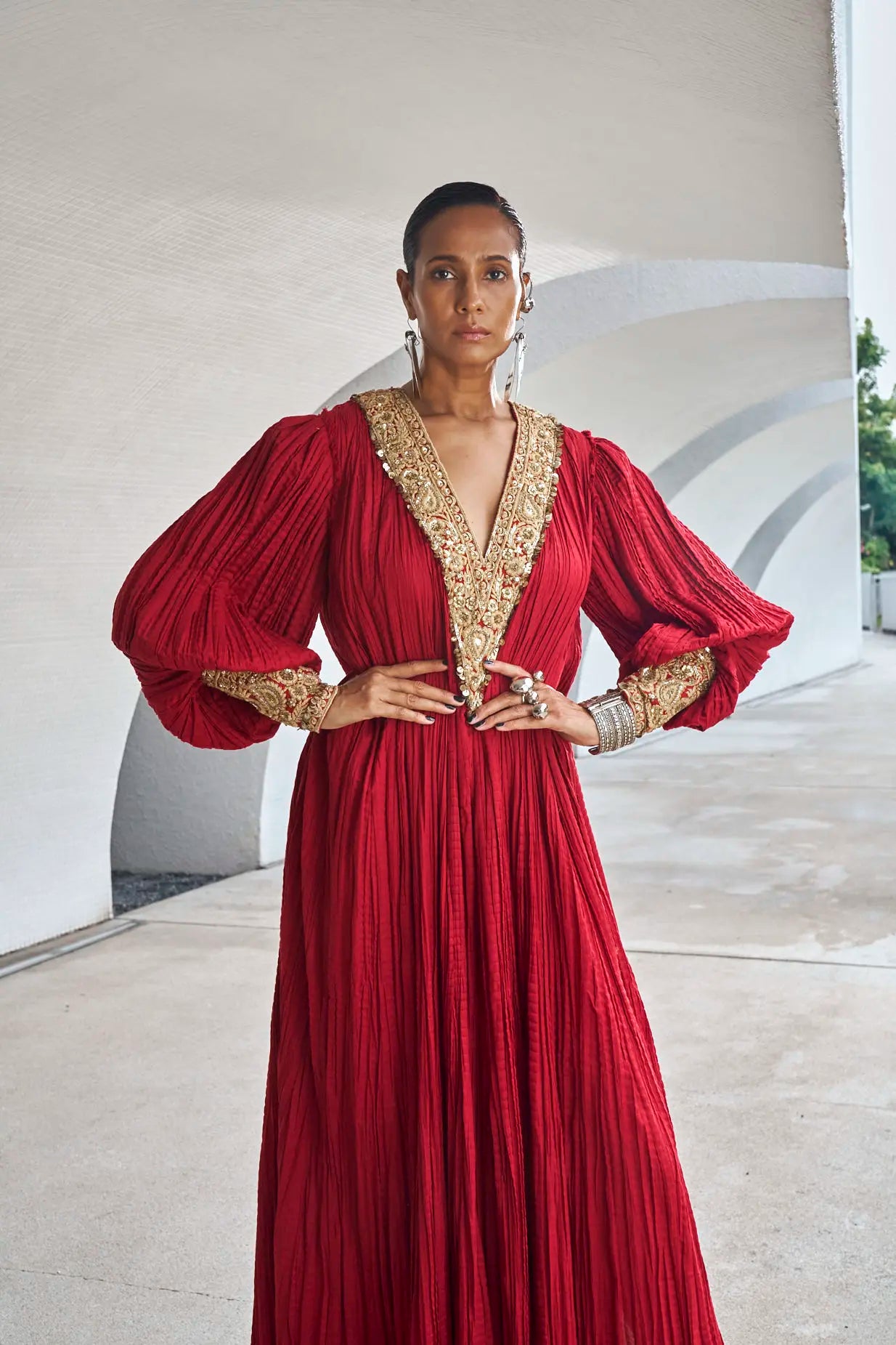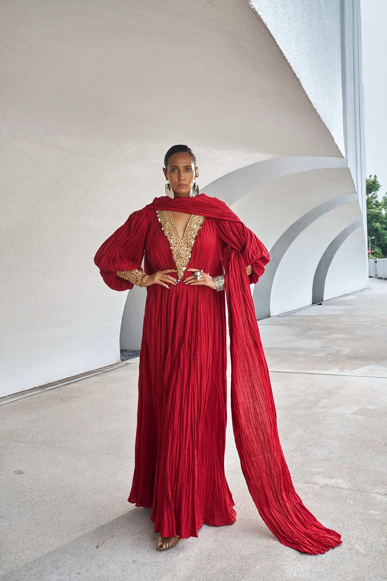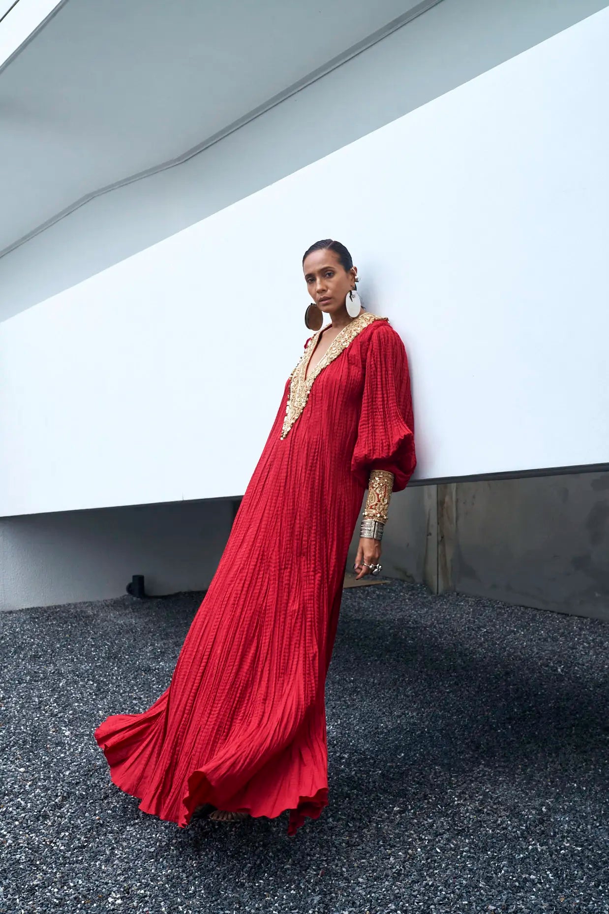 Kaftan: Deep Scarlet Red crushed floor length kaftan crafted in pure cotton using embroidery techniques of thread, zari, dabka and sequins work on front and back necklines and sleeves.