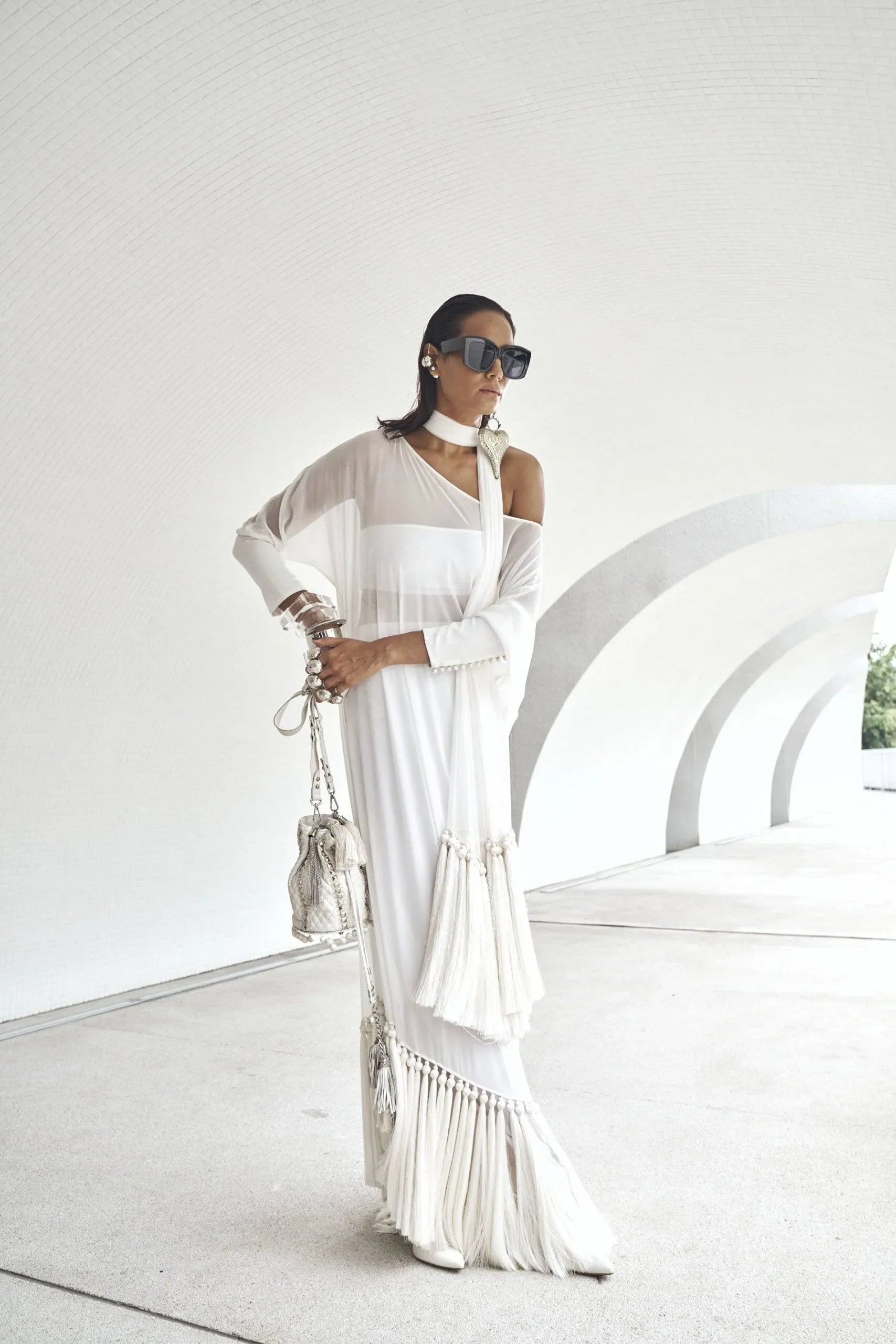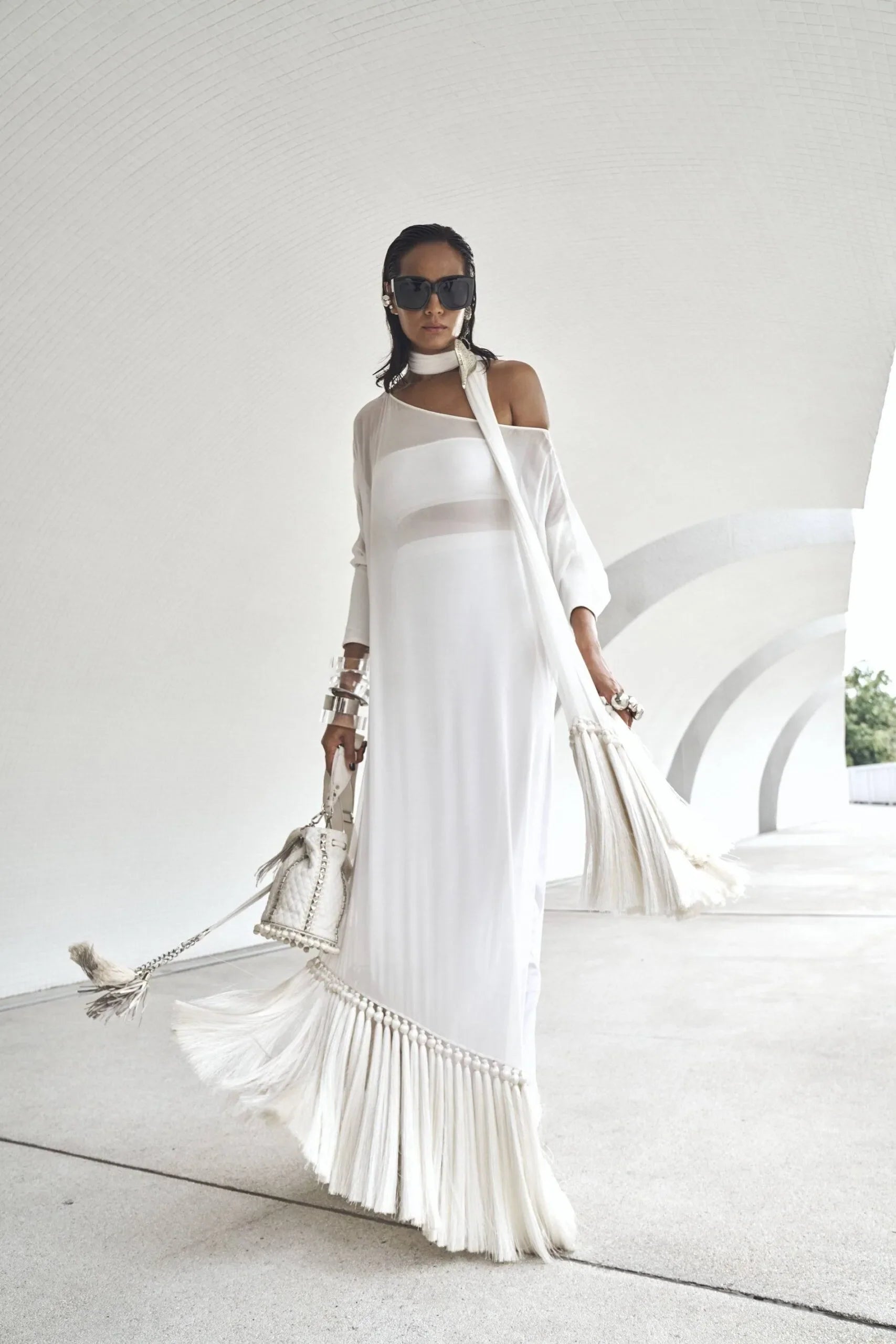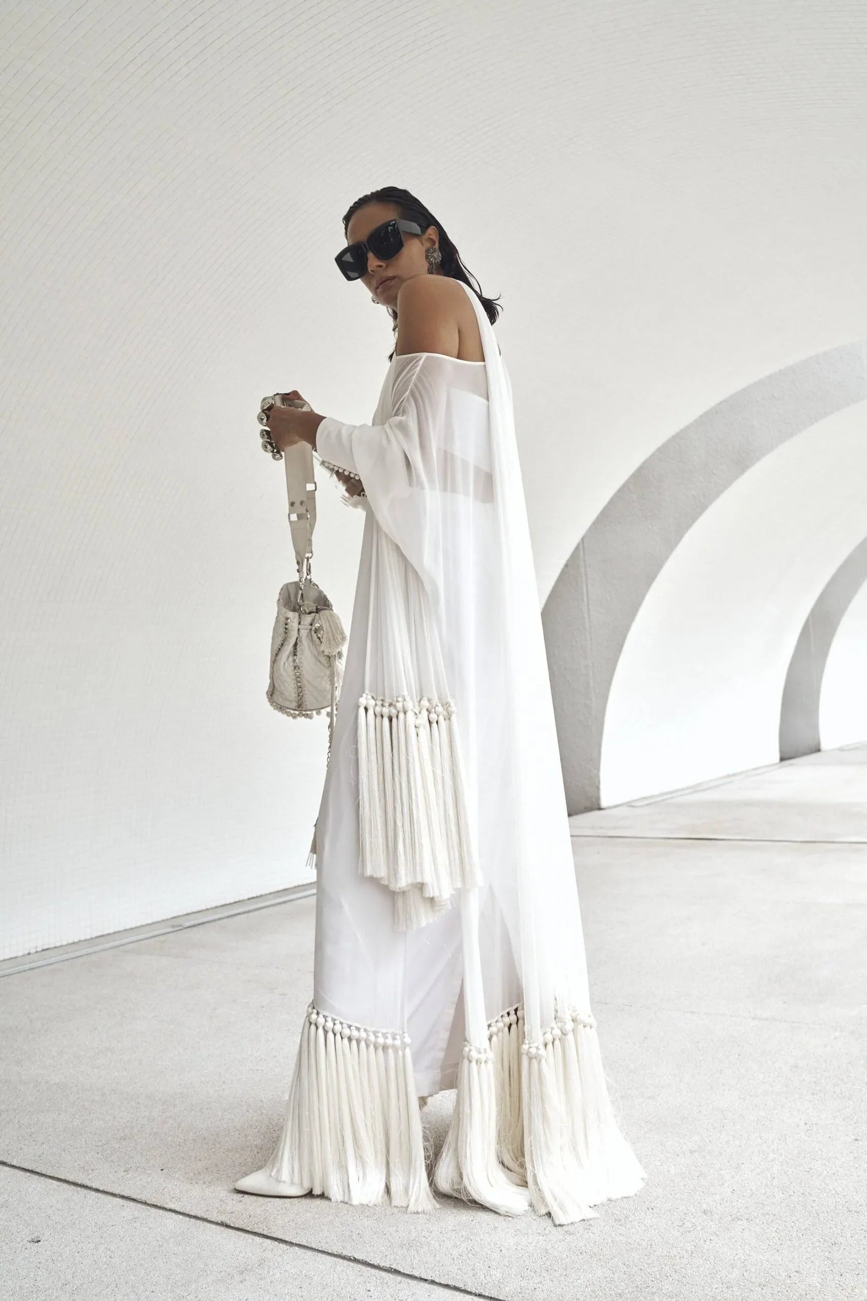 Shirt: Milky white off shoulder floor length shirt in 60 gram pure chiffon georgette with tassels, baggy sleeves with loop buttons detailing. Inner tube made with lycra stretch (can be converted into camisole or long lining- charges may apply for long lining).