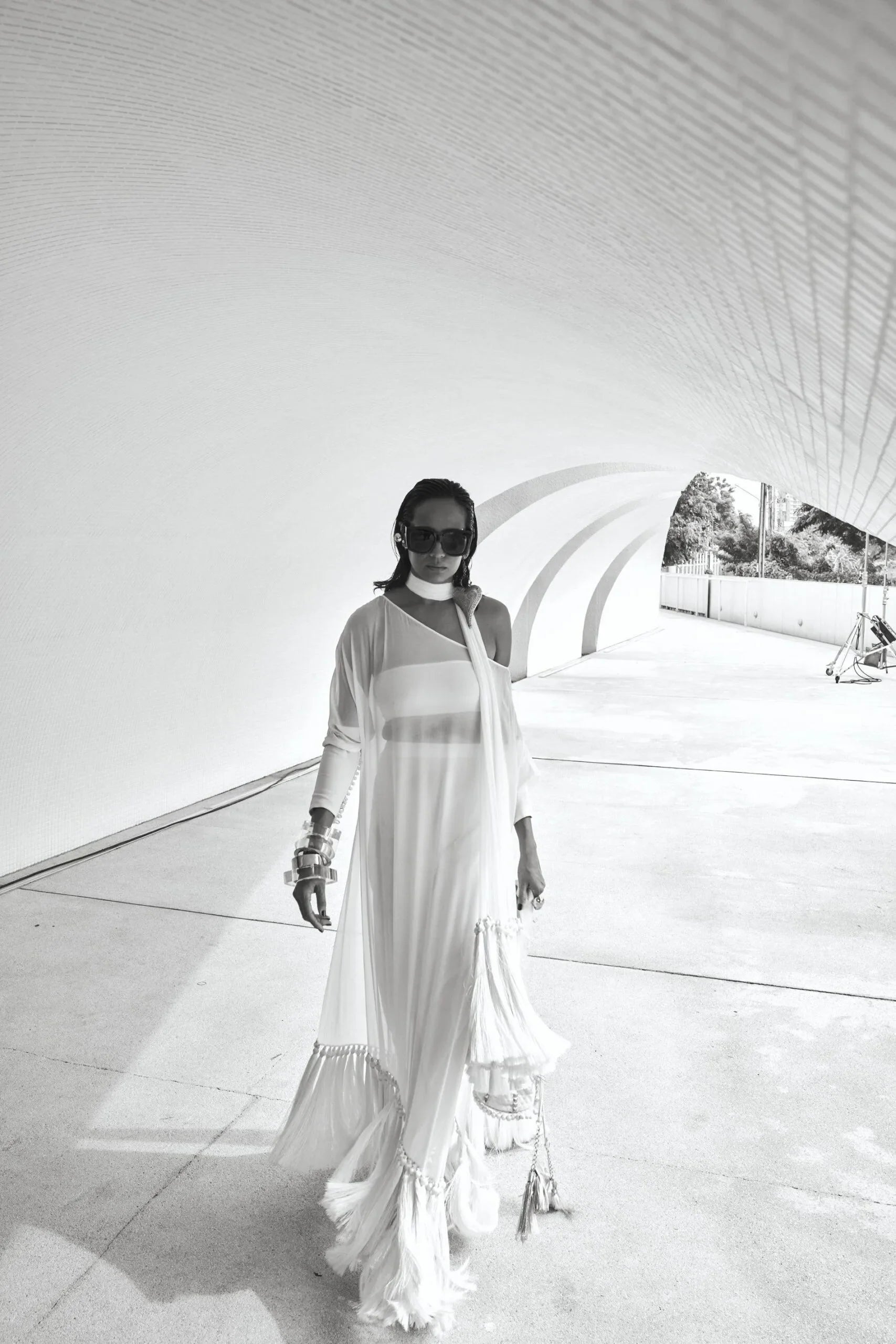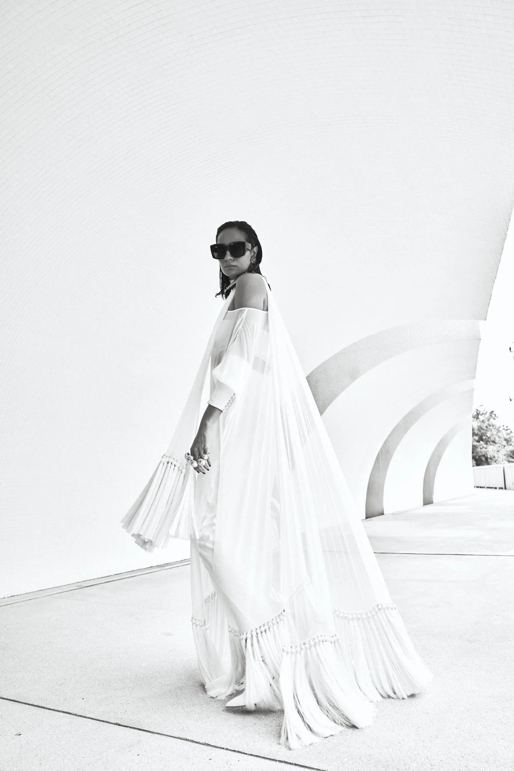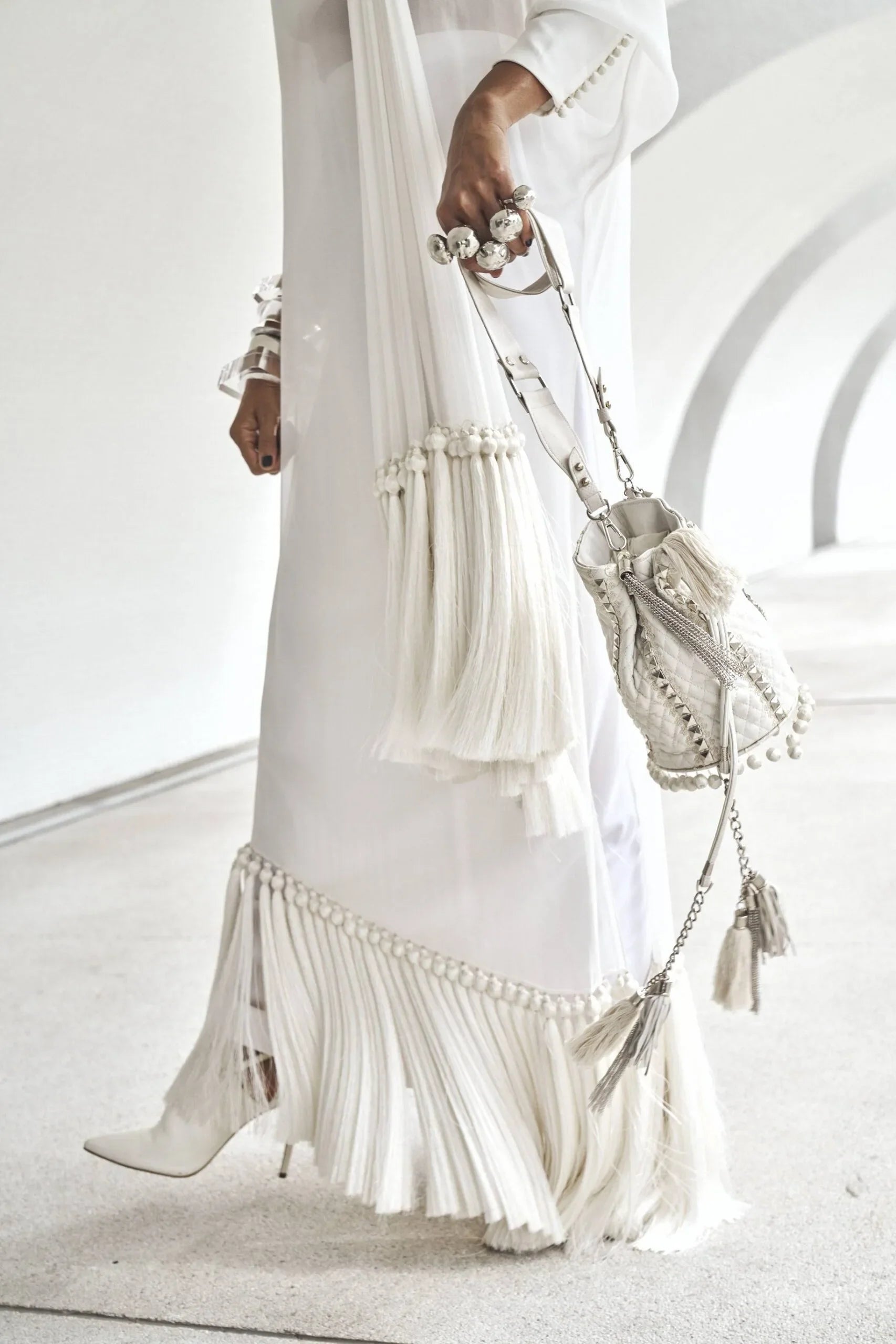 Shirt: Milky white off shoulder floor length shirt in 60 gram pure chiffon georgette with tassels, baggy sleeves with loop buttons detailing. Inner tube made with lycra stretch (can be converted into camisole or long lining- charges may apply for long lining).