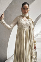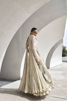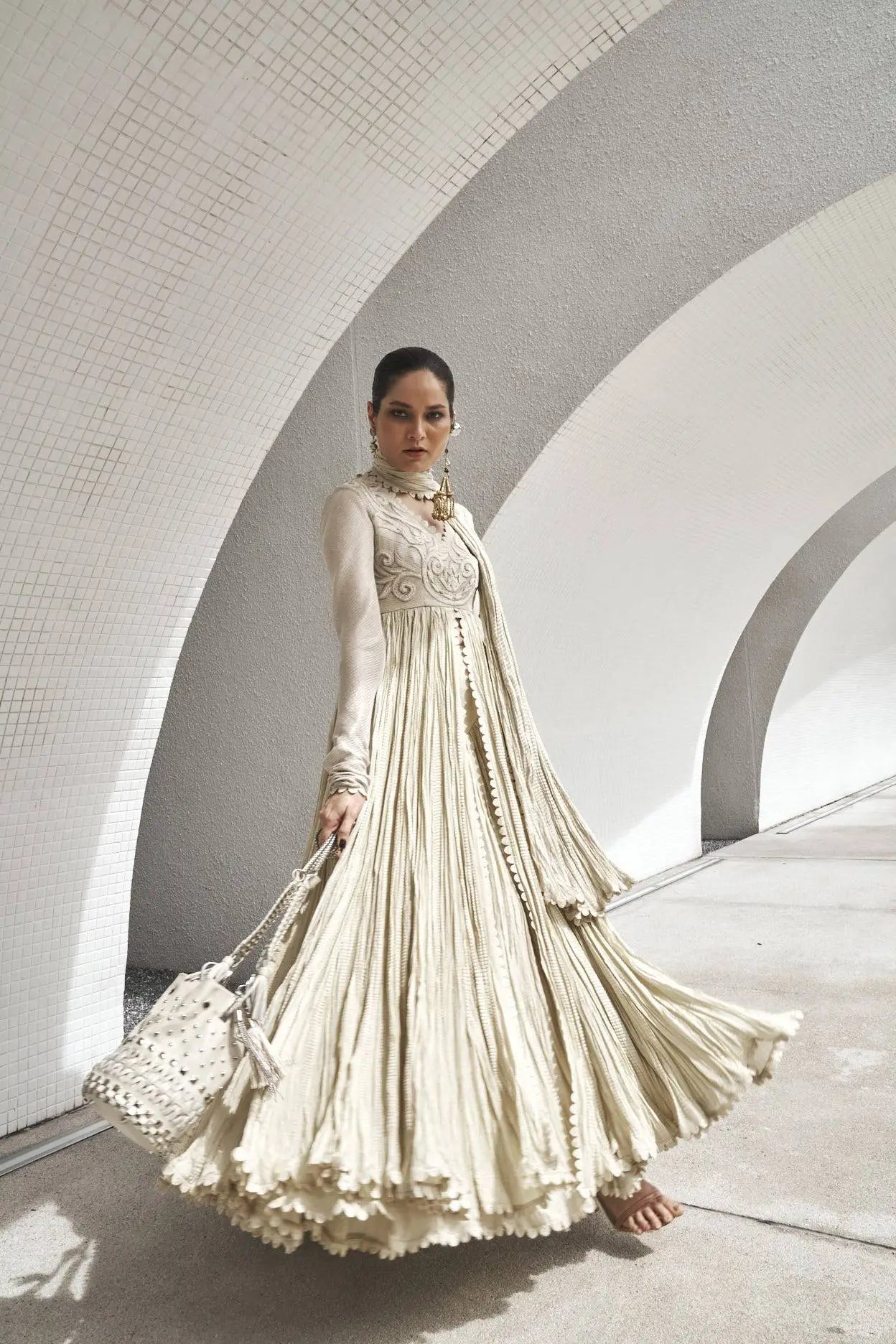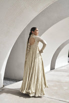 Anaarkali: Taupe colored flared crushed anarkali having zari jute net bodice with thread work, chooridar sleeves. The outfit is made with russian grip fabric finished with in-house made scallop all over.