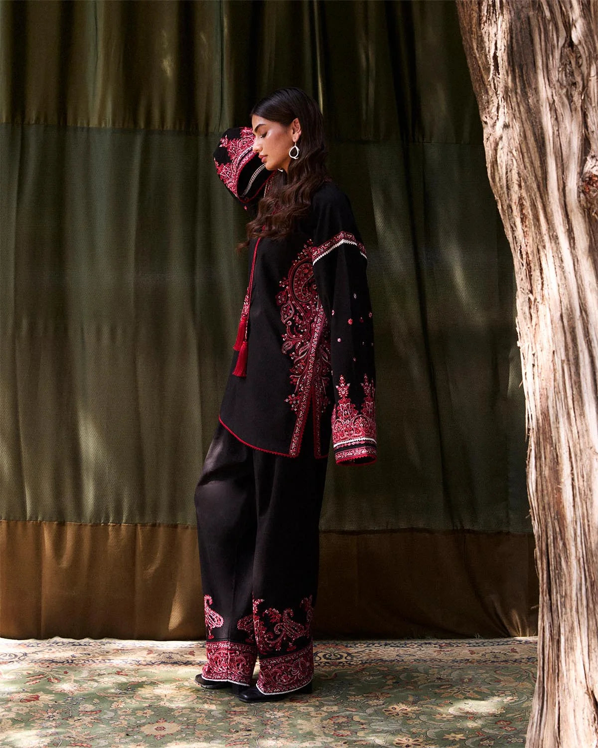 A black short shirt adorned with multicolor Kashmiri embroidery, finished with tassels that sway with movement. Sleeves bloom with the same artistry, while the matching embroidered shalwar and scarf create a complete harmony of heritage and modern grace.