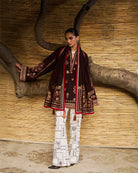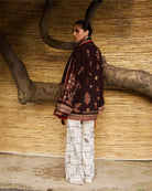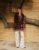 A short brown shirt with multicolor embroidery, styled with bell sleeves and paired against ivory pants. A matching embroidered scarf brings balance — earthy richness set against serene contrast.