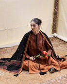 A long burnt-orange shirt, alive with multicolor embroidery and delicate tassels, paired with fitted sleeves and matching shalwar. A black embroidered scarf adds contrast, heightening the drama of this regal silhouette.