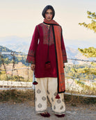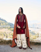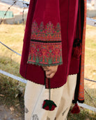Description: Elevate your winter wardrobe with this exquisite ensemble, featuring a rich red Kashmiri-embroidered shirt adorned with intricate patterns on the neckline and sleeves. Delicate tassels add a playful touch, enhancing its artisanal charm. The almond-colored shalwar, embellished with linear embroidery, offers a perfect contrast, exuding understated sophistication. The look is completed with a printed wool shawl that showcases a blend of traditional and contemporary aesthetics, designed to keep you warm while making a statement. Perfect for festive occasions or cozy winter gatherings, this outfit combines heritage craftsmanship with modern elegance.