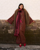 Description: This elegant ensemble features a caramel-colored panel shirt with intricate cross-stitch embroidery and playful tassels, creating a blend of traditional craftsmanship and contemporary flair. Paired with a matching caramel-colored shalwar, also adorned with cross-stitch embroidery, the outfit exudes effortless sophistication. The look is completed with a maroon-colored printed wool shawl, decorated with tassels for added charm and warmth. Perfect for both casual and festive occasions, this ensemble combines rich earthy tones and detailed embellishments for a stylish, comfortable, and eye-catching look.