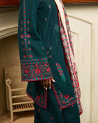 Description: This vibrant ensemble features a multi-colored embroidered emerald green panel shirt, enhanced with delicate tassels that add movement and charm. The multi-colored embroidered bell sleeves create a striking contrast, infusing the outfit with intricate detail and lively color. Paired with a matching multi-colored embroidered shalwar, the look is both coordinated and eye-catching. The ensemble is completed with an ivory-colored printed wool shawl, adorned with tassels, offering warmth and a soft, elegant finish. Perfect for festive occasions or cultural gatherings, this outfit beautifully combines rich embroidery and vivid hues for a stunning, sophisticated look.