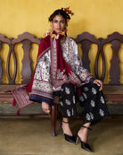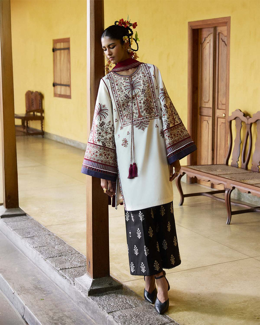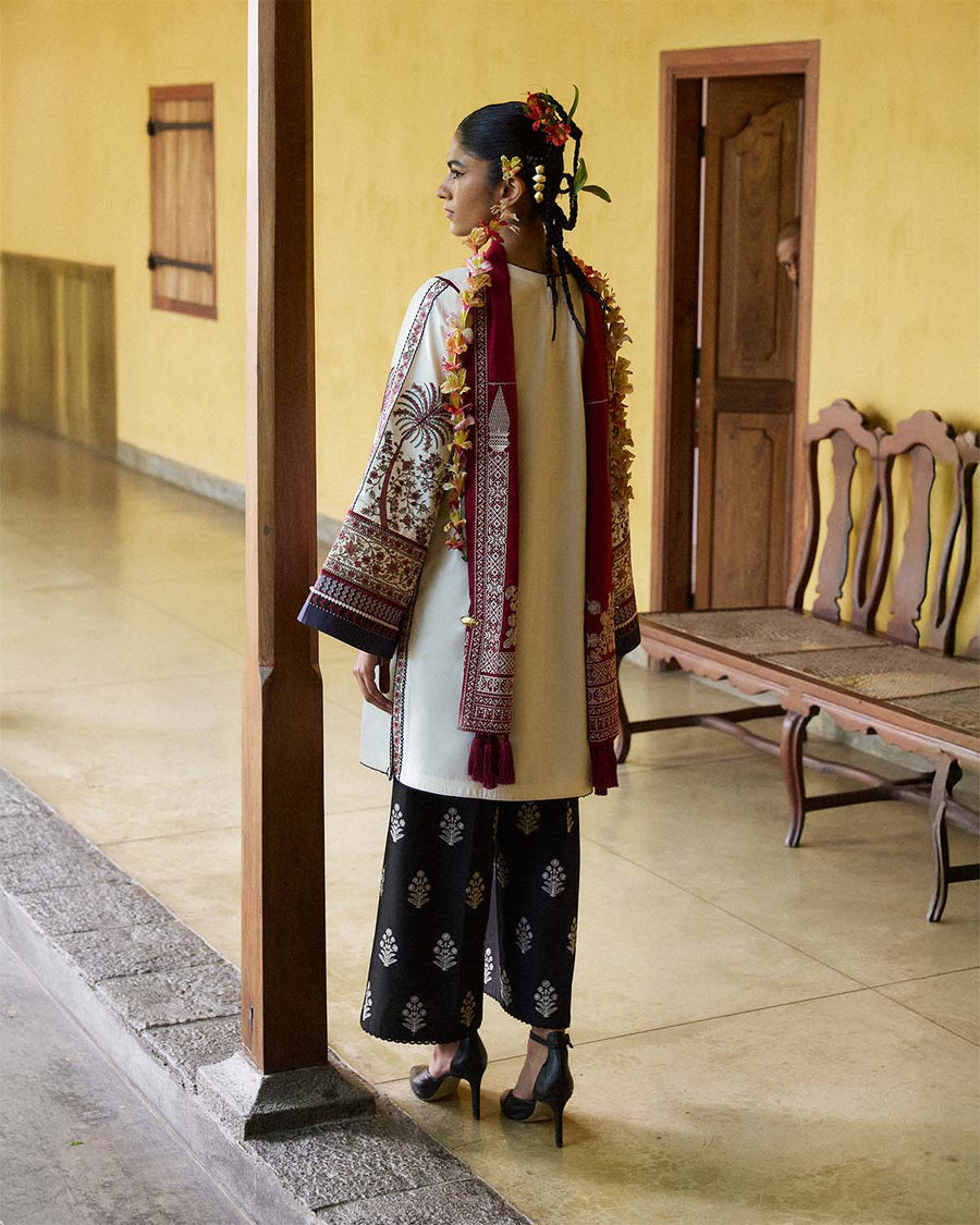 Description: A timeless ode to heritage craftsmanship, this ensemble is a perfect blend of tradition and modernity. The ivory-colored short shirt is adorned with intricate traditional embroidery, celebrating artisanal detailing. Tassels along the hem add a touch of movement, while the sleeves feature elaborate embroidery, finished with a printed border for a striking contrast. Paired with black culottes featuring delicate linear embroidery, the look exudes understated elegance with a contemporary edge. The structured silhouette of the culottes balances the ornate details of the shirt, making it a versatile statement piece. Completing the ensemble is a red monochrome embroidered scarf, richly detailed with intricate patterns and finished with playful tassels. The bold contrast of red against the neutral tones adds depth, making this outfit a sophisticated choice for any occasion.