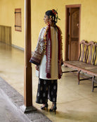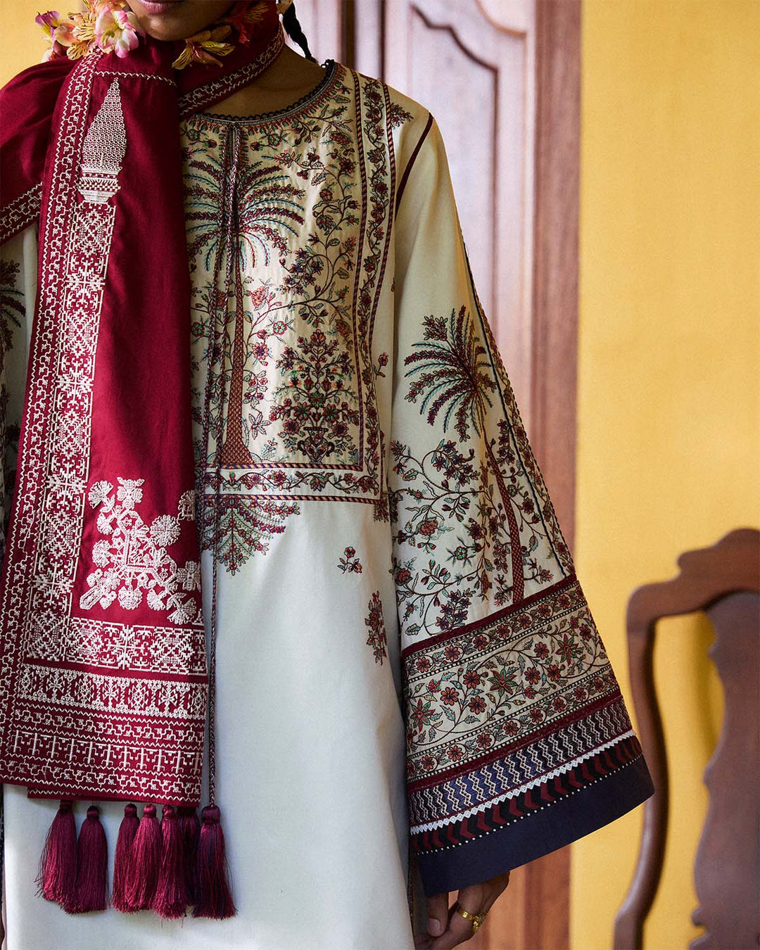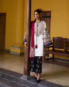 Description: A red monochrome embroidered scarf, richly detailed with intricate patterns and finished with playful tassels. The bold contrast of red against the neutral tones adds depth, making this outfit a sophisticated choice for any occasion.