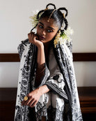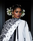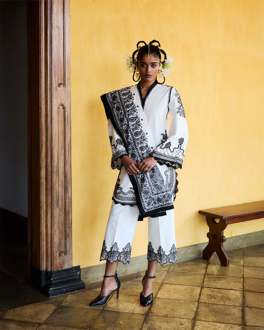 Description: A printed scarf completes the outfit, introducing a subtle play of patterns that perfectly ties the ensemble together. Thoughtfully designed, this look is a celebration of heritage craftsmanship with a modern sensibility.