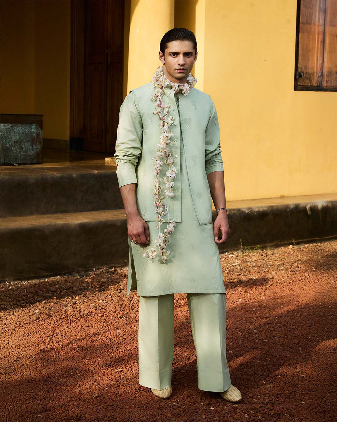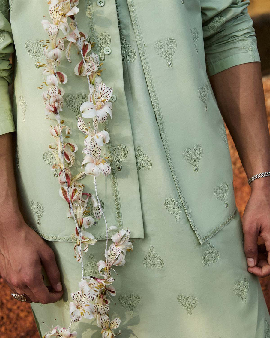 Description: A refined blend of tradition and modern elegance, this ensemble is crafted with intricate monochrome Pani embroidery. The pastel green waistcoat features delicate tonal embroidery, adding depth and sophistication to its structured silhouette. Designed for effortless grace, it pairs seamlessly with the matching pastel green shirt, which showcases the same exquisite embroidery for a cohesive and polished look. Completing the ensemble is a plain pastel green shalwar, offering a balanced contrast to the detailed embroidery. Perfect for cultural gatherings and formal occasions, this outfit embodies timeless craftsmanship and understated luxury.