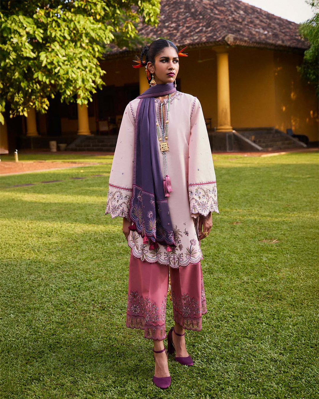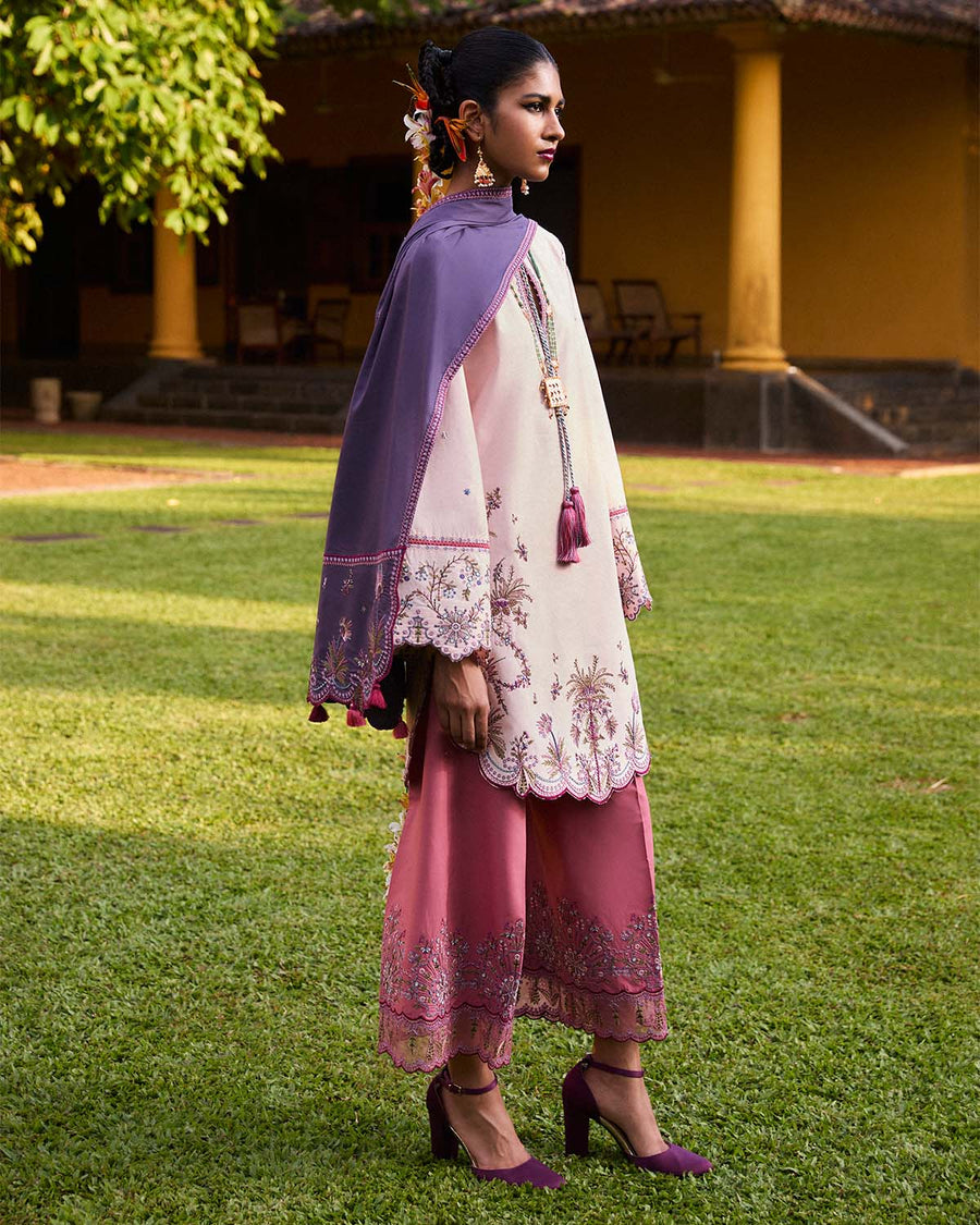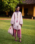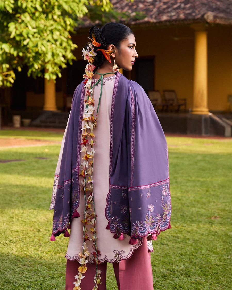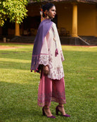 Description: A striking purple scarf, richly embroidered with multicolor threadwork, adding contrast and depth. Thoughtfully designed for those who appreciate detailed artistry, this ensemble embodies timeless charm with a modern twist.
