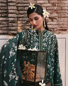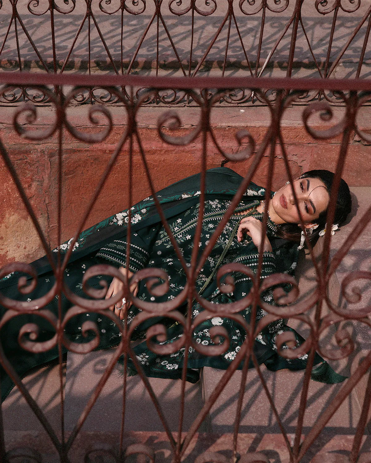This elegant ensemble showcases a monochrome floral embroidered shirt adorned with intricate threadwork, exuding timeless grace. The sleeves echo the same delicate detailing, while the traditionally embroidered trouser adds a refined charm. Finished with a printed wool shawl, this look embodies classic sophistication and timeless elegance.