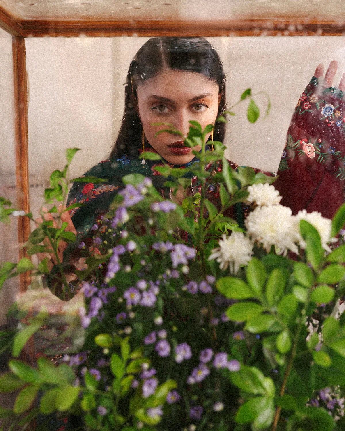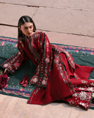 This elegant ensemble showcases a richly embroidered shirt adorned with multicolor floral motifs and intricate boring details. The matching sleeves and shalwar echo the same exquisite embroidery, creating a harmonious and refined look. Paired with a vibrant printed wool shawl featuring bold floral patterns, this outfit blends timeless charm with contemporary elegance — a signature piece that celebrates the art of timeless fashion.