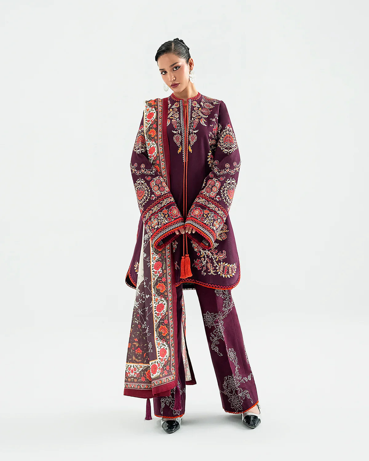 A tribute to heritage craftsmanship, this deep purple ensemble features a beautifully crafted shirt adorned with intricate multicolor traditional embroidery, reflecting timeless artistry. The sleeves are richly embroidered in matching hues, adding depth and continuity to the design. Paired with a monochrome embroidered trouser and a printed wool shawl, the outfit embodies classic grace and cultural sophistication.