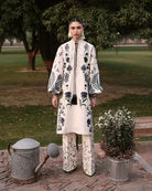 An ivory garment adorned with vibrant floral embroidery — the shirt blossoms with multicolored threads, the sleeves echo the motif from shoulder to cuff, and the matching trousers carry the design through. A printed wool shawl drapes gently, its soft texture and subtle print adding refinement. Together the pieces craft a look of heritage‑rich elegance, ideal for both festive and timeless occasions.