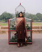 This deep brown traditional attire celebrates the beauty of Kashmiri craftsmanship. It features a beautifully detailed shirt adorned with rich multicolor Kashmiri embroidery, reflecting timeless artistry and cultural elegance. The sleeves and trousers are embellished with matching Kashmiri motifs, creating a harmonious and regal look. A printed wool shawl enhances the ensemble with its soft texture and classic charm, perfect for refined winter styling.