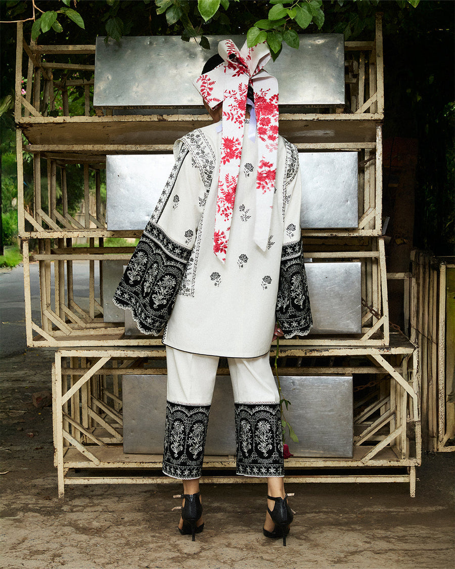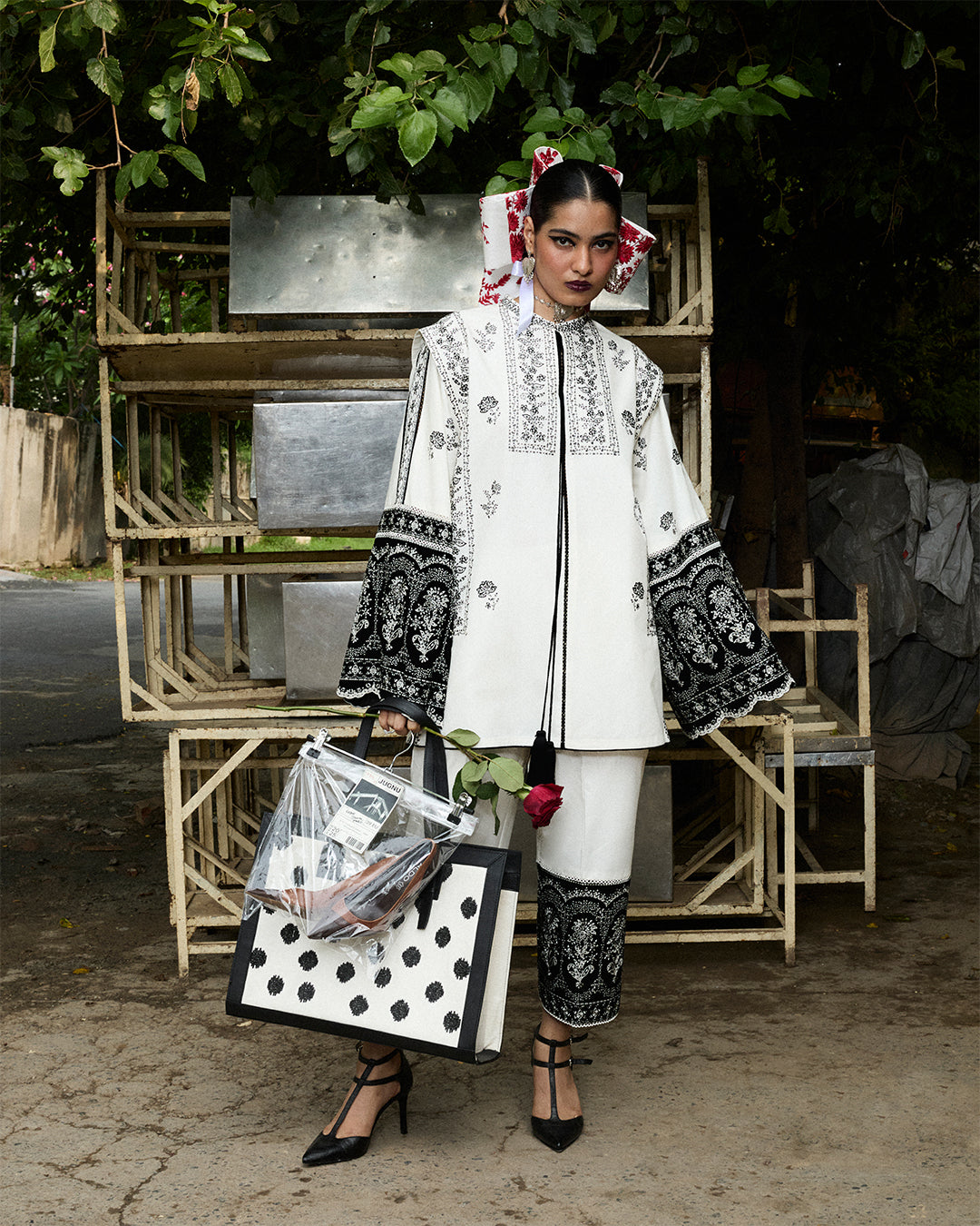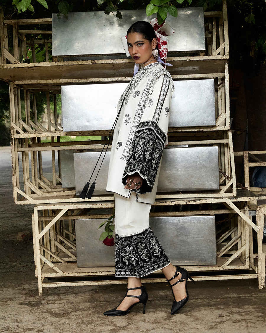 Description: In serene ivory and bold black, this monochrome set is defined by thoughtful embroidery and clean lines. The short shirt features a playful tassel accent, while bell sleeves edged in black, offer a subtle drama. Paired with ivory culottes framed by black borders, the ensemble feels both classic and contemporary.