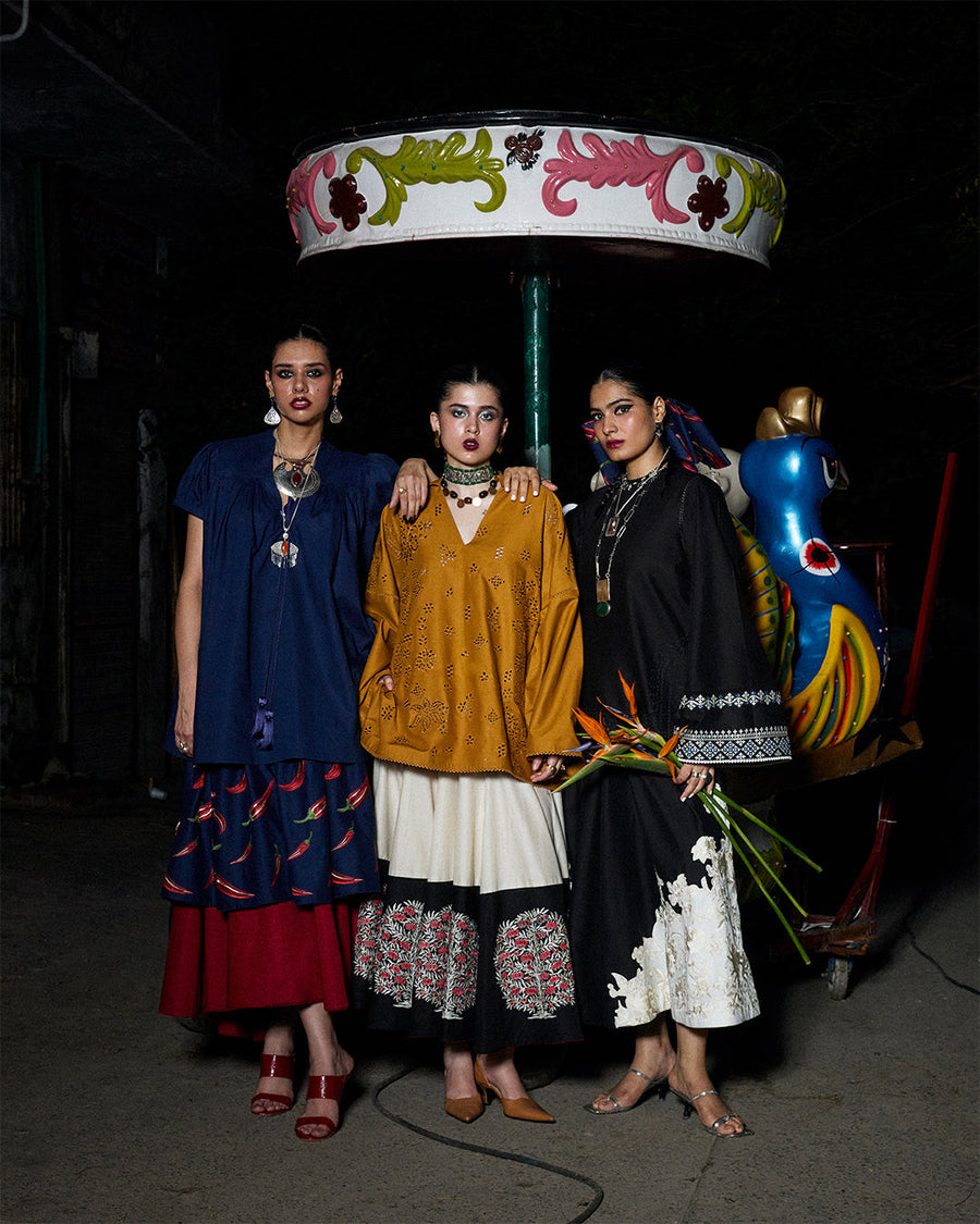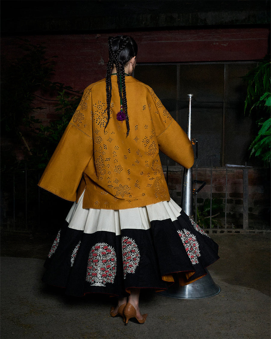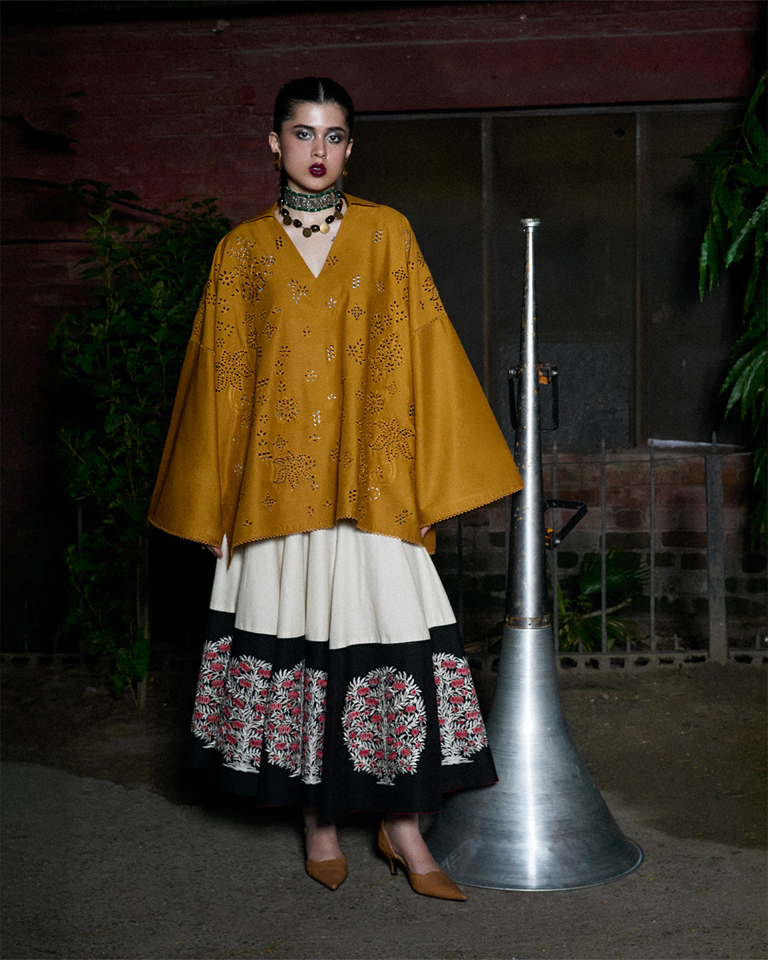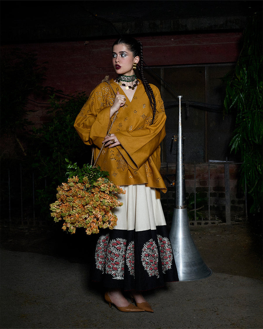 Description: Mustard warmth meets tradition in this embroidered shirt, paired with an ivory skirt edged in a black embroidered border. A look where bold color meets timeless craft.