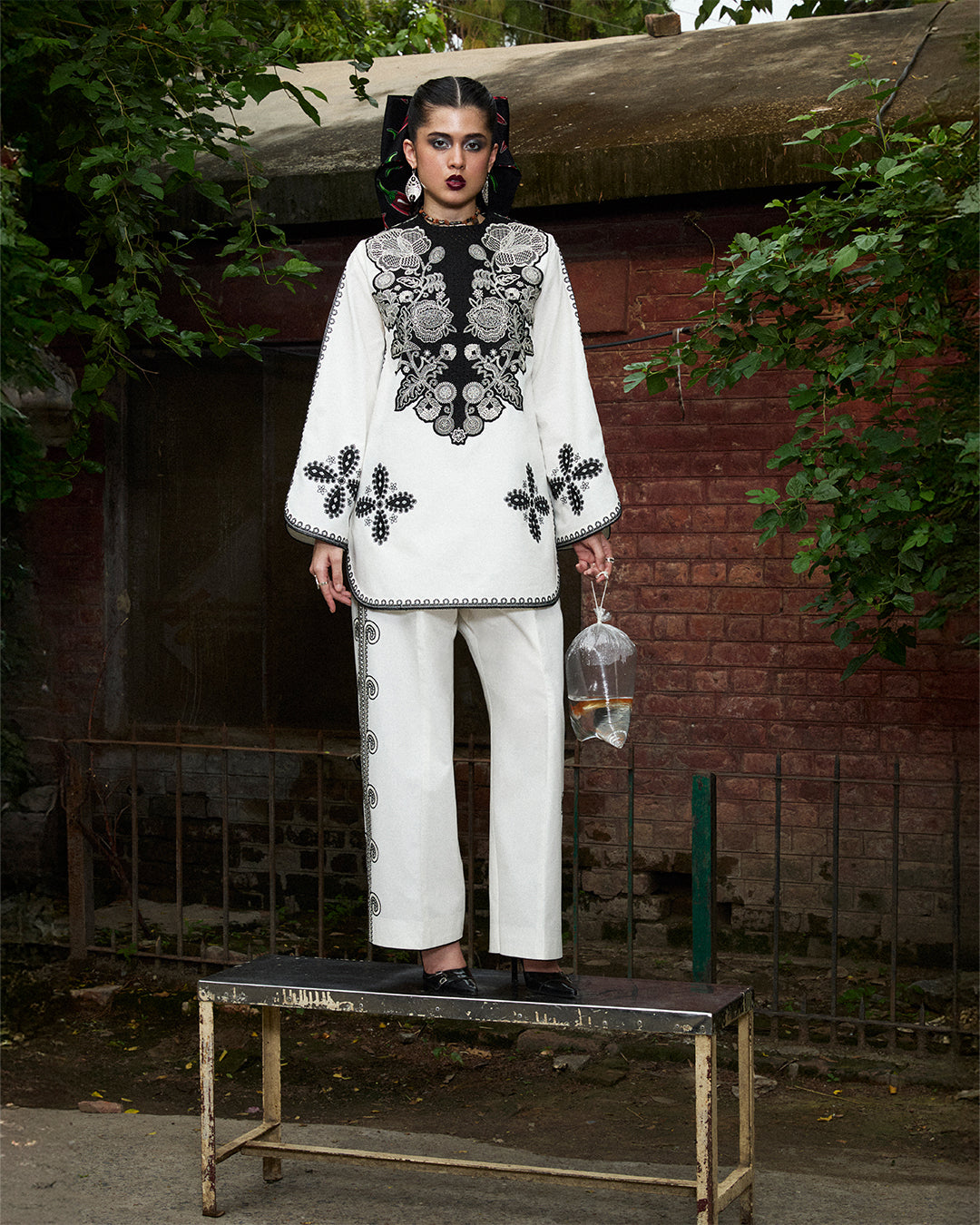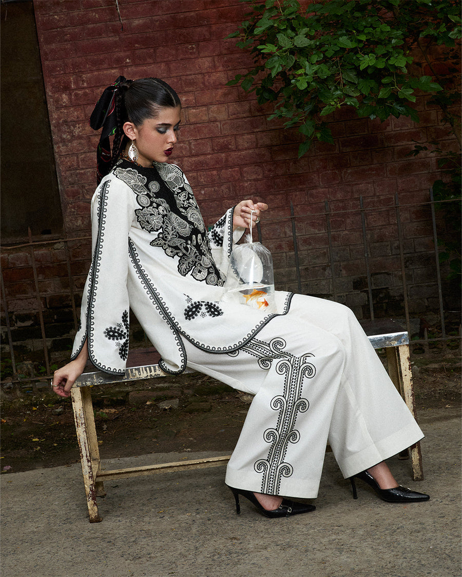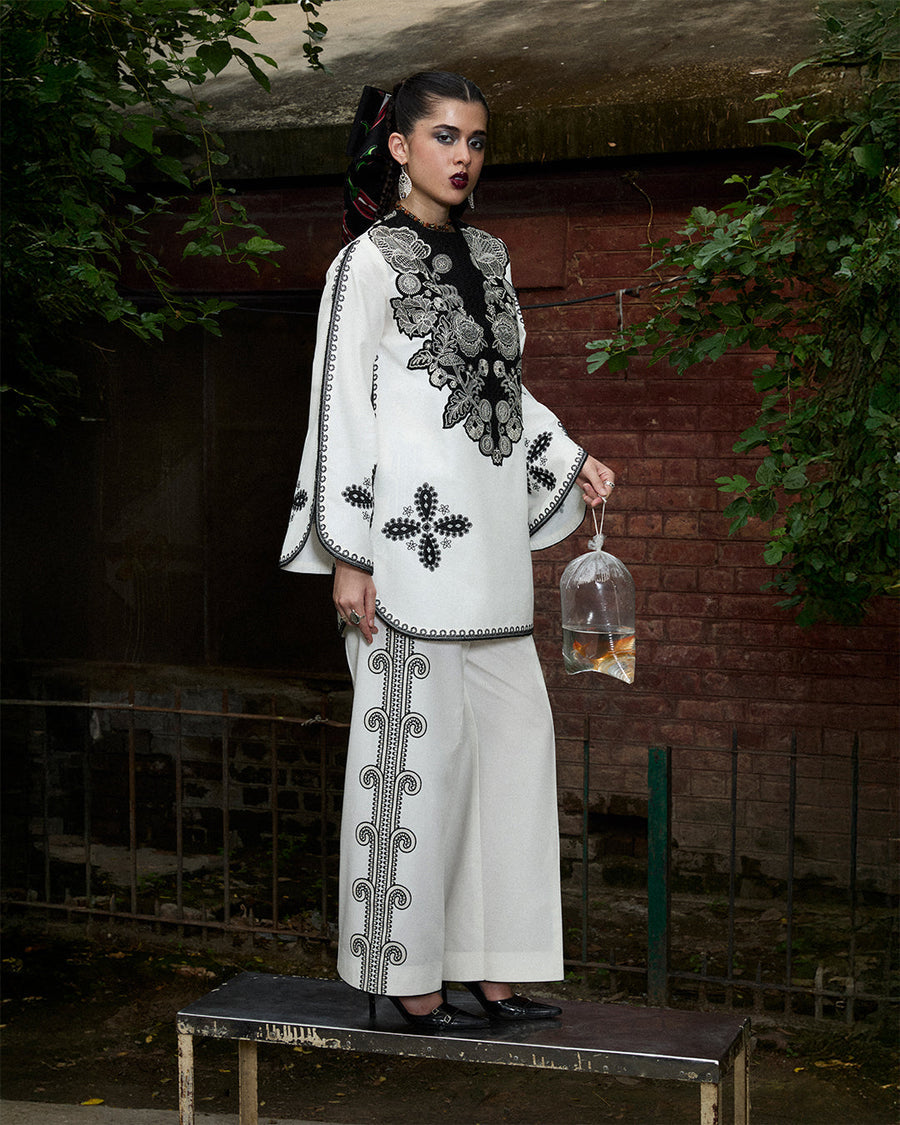 Description: A study in monochrome romance, this ivory short shirt blooms with floral embroidery and is framed by a striking black embroidered patch at the neckline. The matching sleeves and pants continue the story, making it a harmonious, head-to-toe statement.