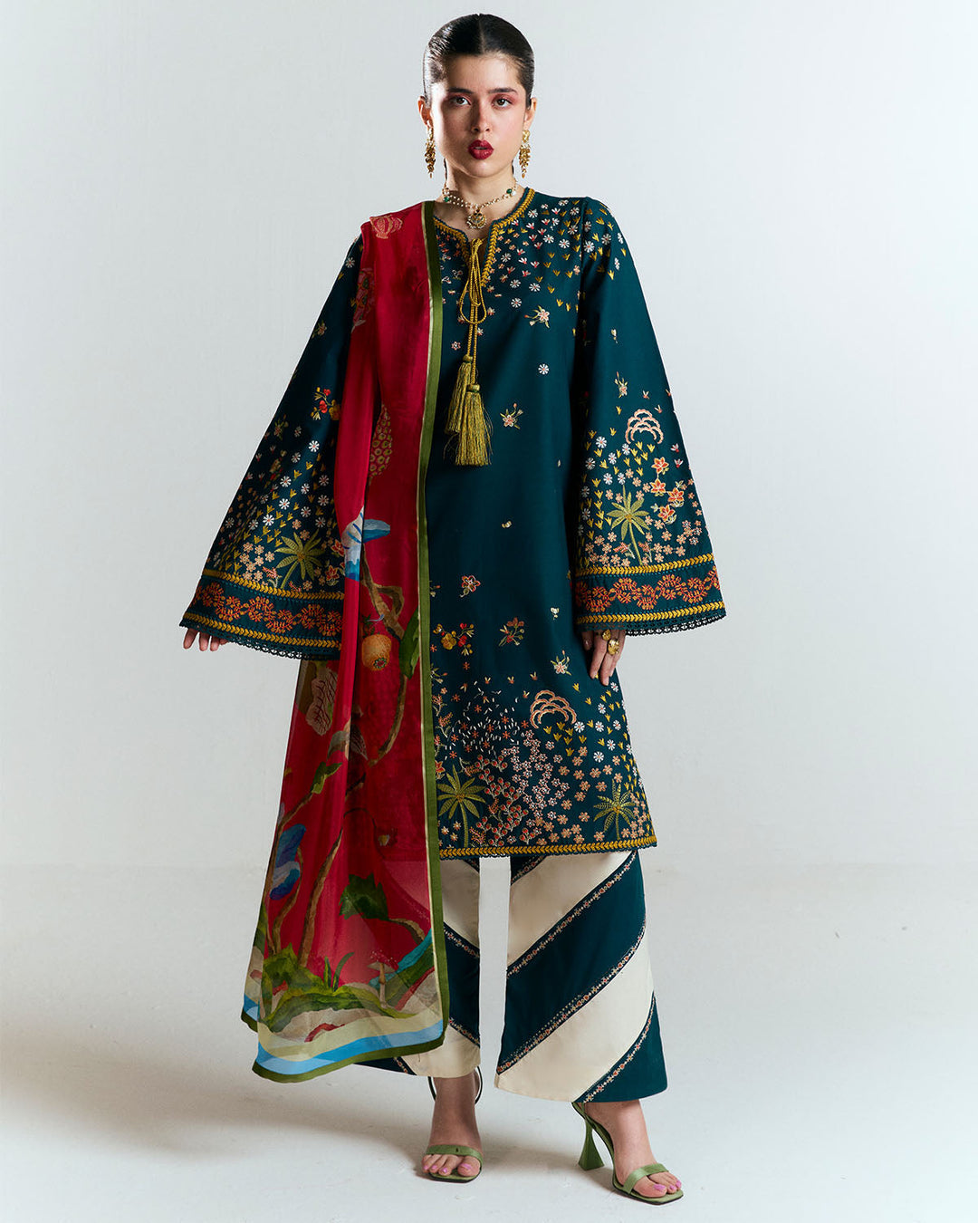 Description: This striking ensemble blends earthy richness with bold artistry. The deep teal shirt is delicately embroidered with multicolor floral motifs that bloom across the fabric like a painted garden. From soft pastels to warm oranges and golds, the embroidery clusters around the hem and sleeves, creating a graceful, cascading effect. The neckline is accentuated with traditional tassel ties, adding a touch of classic charm to the modern silhouette. The matching teal culottes carry forward the embroidered detailing. Beige trims at the hem provide a soft contrast, breaking up the deep tones and adding dimension. Completing the look is a digitally printed silk dupatta, dramatic in its use of vibrant reds and lush greens, with painterly strokes and botanical elements that flow with every movement. Together, the pieces create a look that feels grounded in tradition but boldly expressive—perfect for statement moments with effortless elegance.