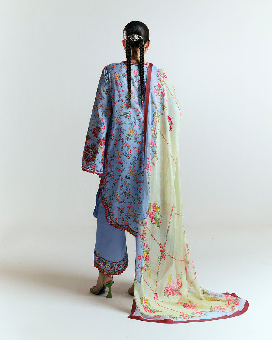Description: Soft, romantic, and intricately detailed—this light blue ensemble captures the beauty of delicate craftsmanship. The shirt features a floral printed base, elevated with multicolor embroidery that blooms gracefully along the neckline, hem, and sleeves. Intricate scalloped borders and tassel ties add depth and charm to the design, enhancing its feminine elegance. Paired with light blue culottes embroidered to mirror the shirt’s detailing, the look maintains a cohesive and refined aesthetic. The digital printed silk dupatta brings a dreamy finishing touch, with painterly florals and soft hues that flow beautifully with every step. A timeless yet fresh statement for the season.