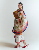 Description: This striking ensemble pairs a mustard yellow shirt with vibrant multicolor floral embroidery and digitally printed trims that add structure and character. The relaxed silhouette and wide embroidered sleeves bring a sense of effortless grace. Paired with ivory culottes, subtly adorned with floral motifs, the look strikes a perfect balance between bold and soft. The digitally printed silk dupatta ties it all together — bursting with rich botanical imagery that adds depth, color, and movement. A fresh take on traditional style, full of warmth and expression.