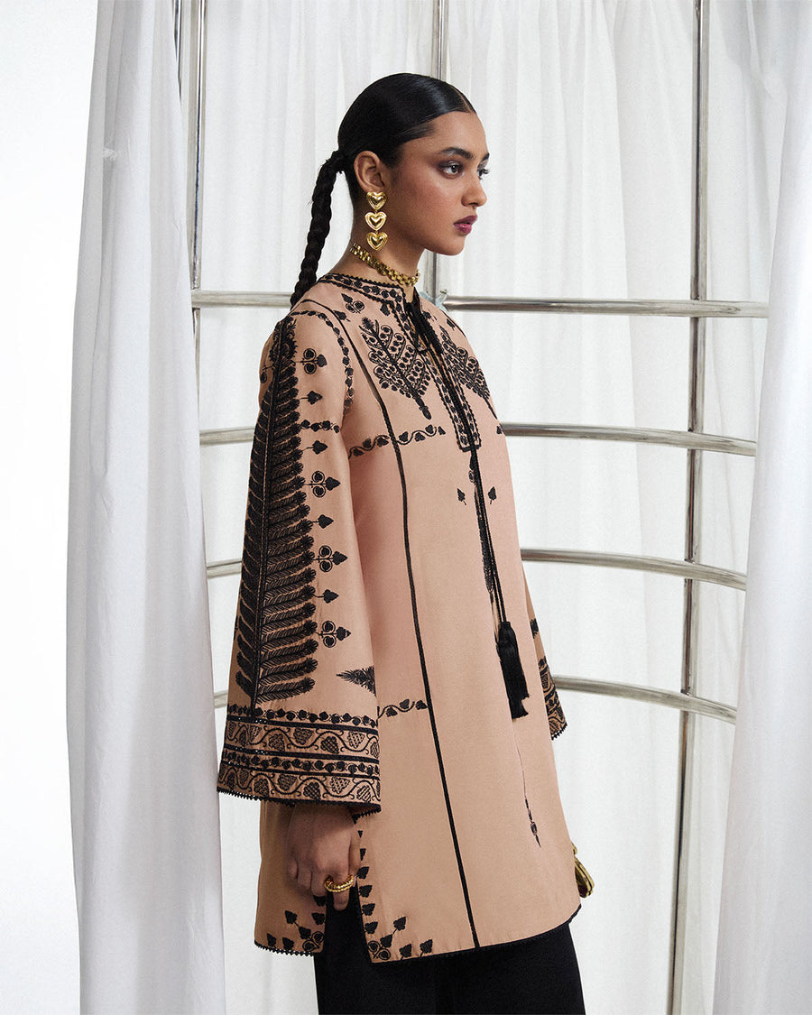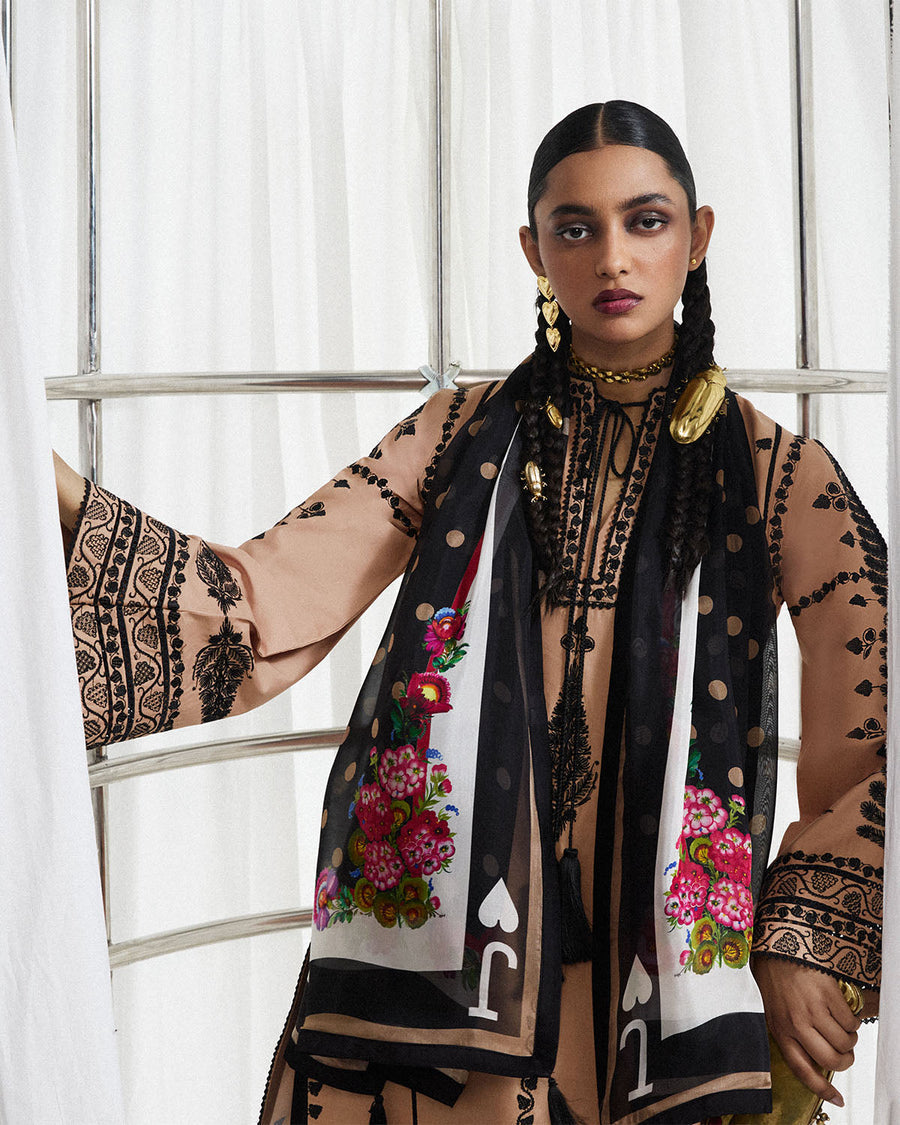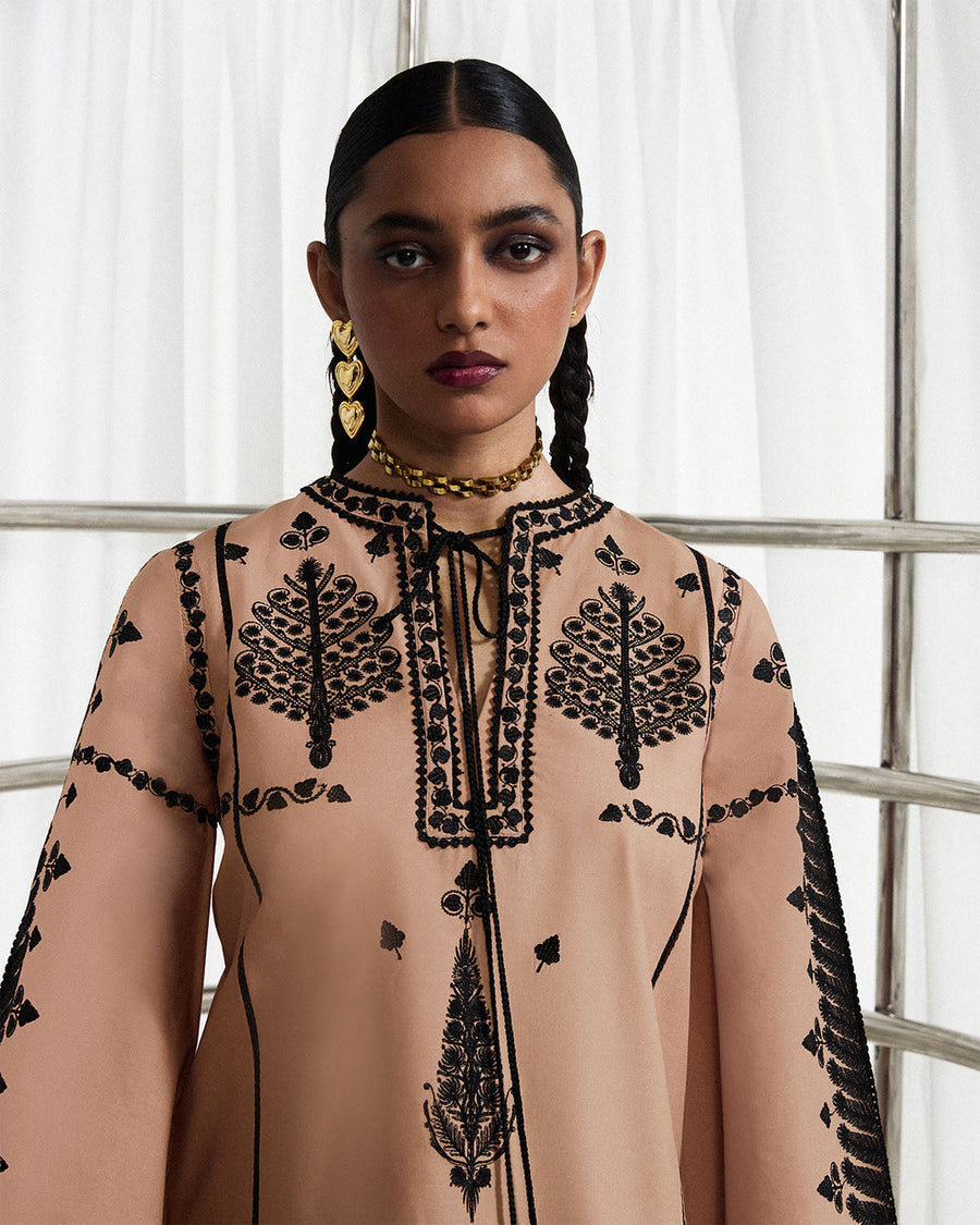 Description: Designed for effortless sophistication, this outfit includes a beige embroidered short shirt with soft tassels and coordinated bell sleeves. The black culottes feature similar tonal embroidery, creating a cohesive yet contrasting look. A digitally printed silk scarf with tassels adds a refined pop of color, making this ensemble both versatile and timeless.