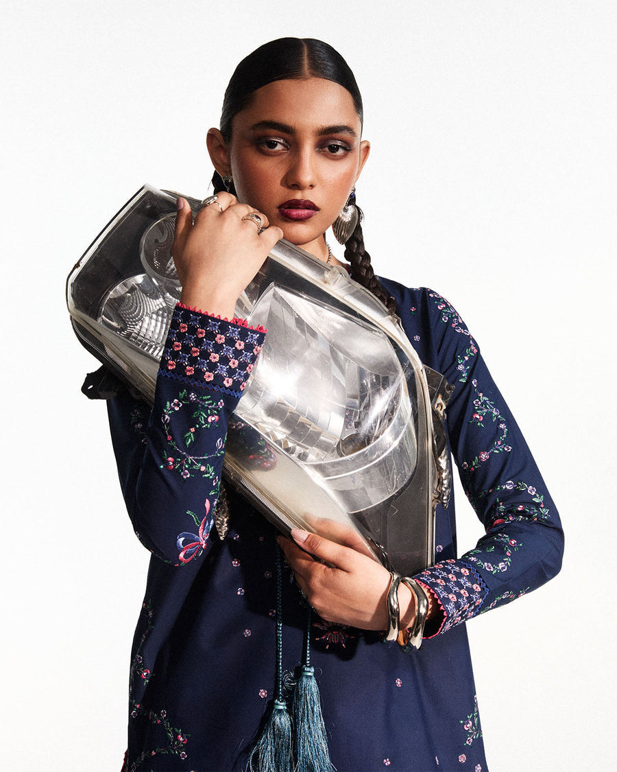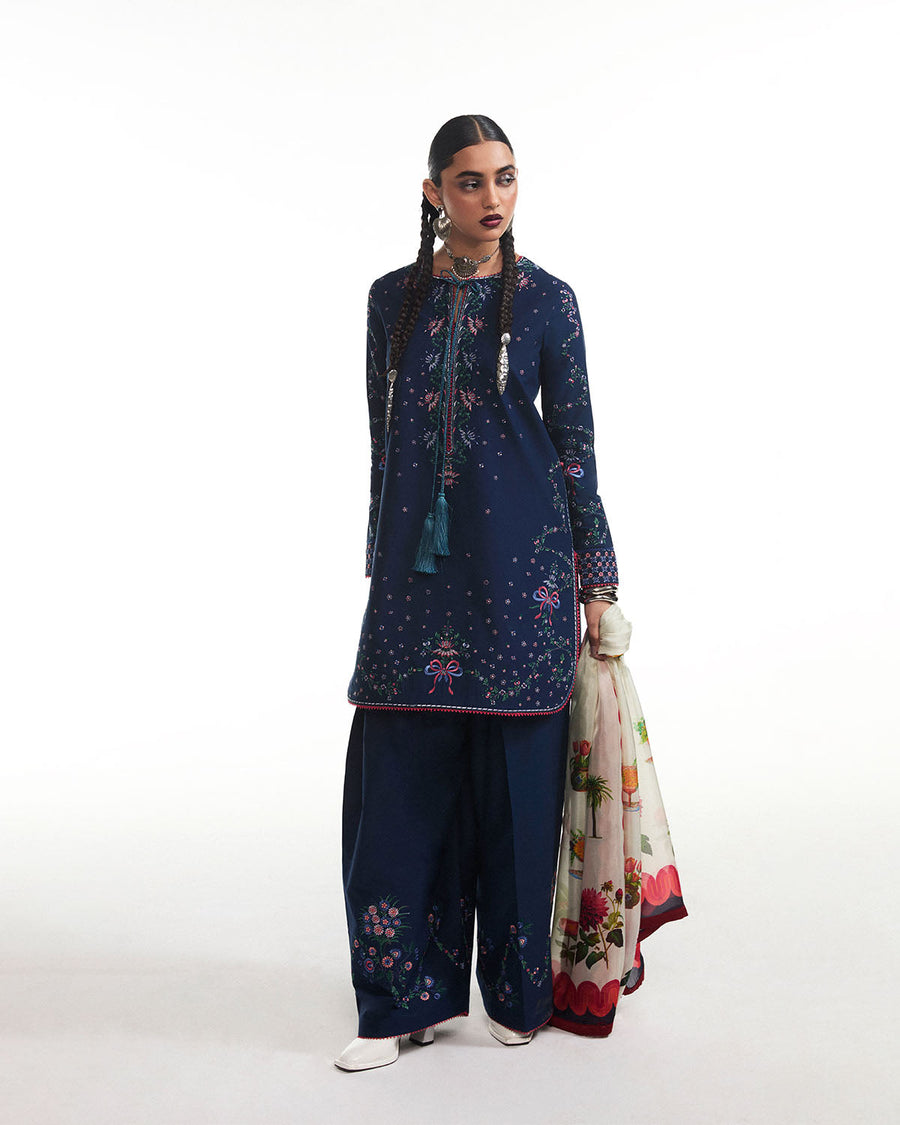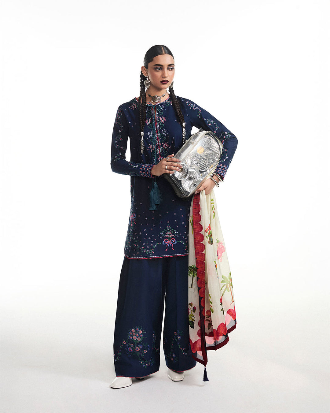 Description: A bold celebration of color and craftsmanship, this navy blue ensemble is richly embroidered with multicolored floral motifs that bring a lively charm to its structured silhouette. The short shirt, accented with tassels, pairs effortlessly with the fitted embroidered sleeves and matching shalwar, creating a harmonious flow of intricate detail. A digitally printed silk scarf with tassels completes the look, adding a touch of softness and movement to this vibrant, statement-making outfit.