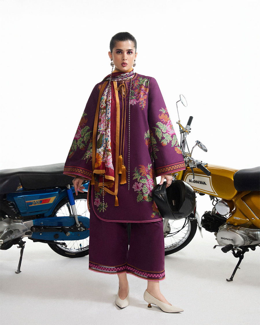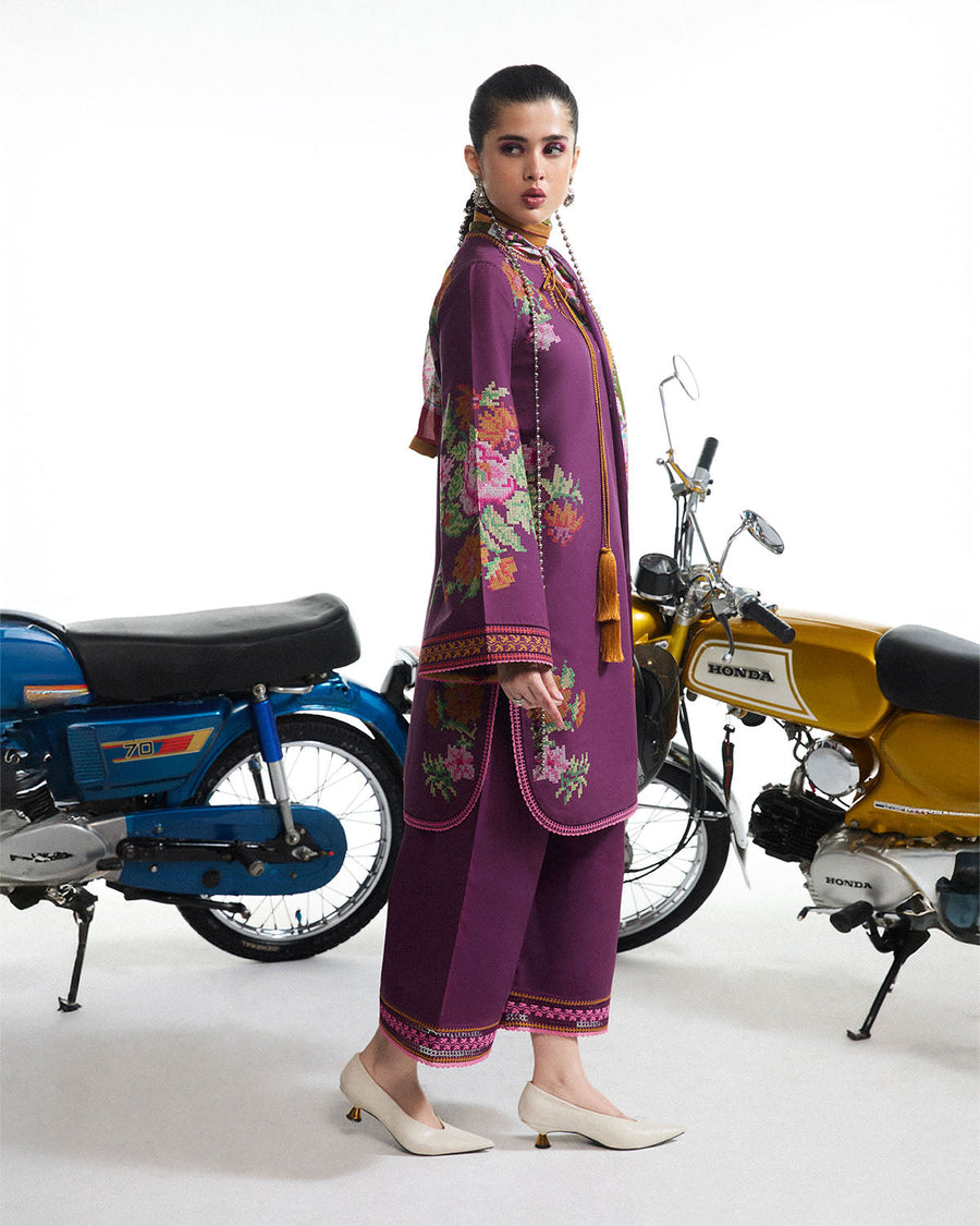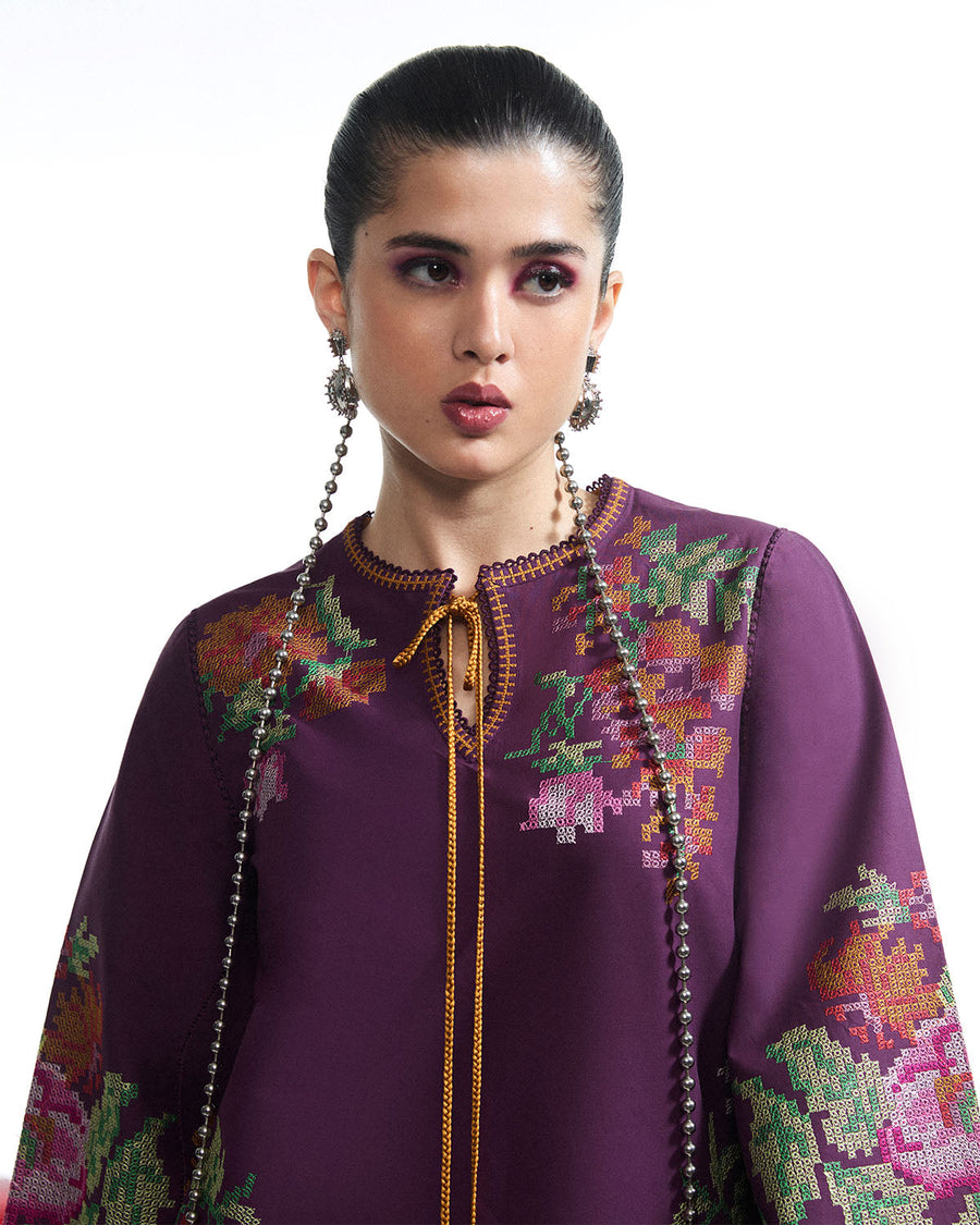Description: This striking ensemble features a deep purple short shirt, richly adorned with multicolored cross-stitch embroidery, celebrating traditional technique with a contemporary edge. The bell sleeves, echoing the same vibrant embroidery, are finished with graceful tassels that add texture and charm. Paired with matching purple culottes, also embroidered in vivid cross-stitch patterns, the outfit offers a cohesive and artistic silhouette. A digitally printed silk scarf, light and fluid, completes the look with its intricate design and delicate tassels, adding a touch of elegance and modern flair.