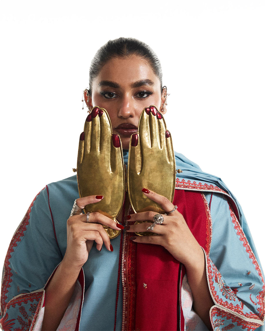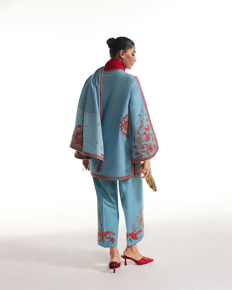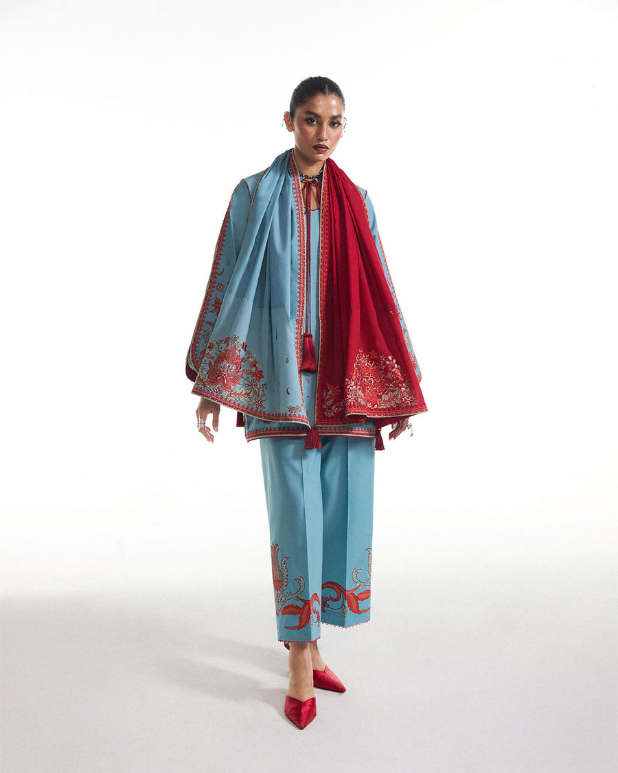 Description: This vibrant ensemble blends tradition with bold color play. The ice blue short shirt is adorned with multicolored traditional embroidery and finished with tassels for added detail. Matching bell sleeves echo the same intricate embroidery, creating a cohesive and visually rich silhouette. Paired with embroidered culottes in the same tone, the look remains balanced and elegant. Completing the outfit is a striking two-tone scarf in red and ice blue, featuring coordinating embroidery and tassels—adding texture, contrast, and cultural charm.