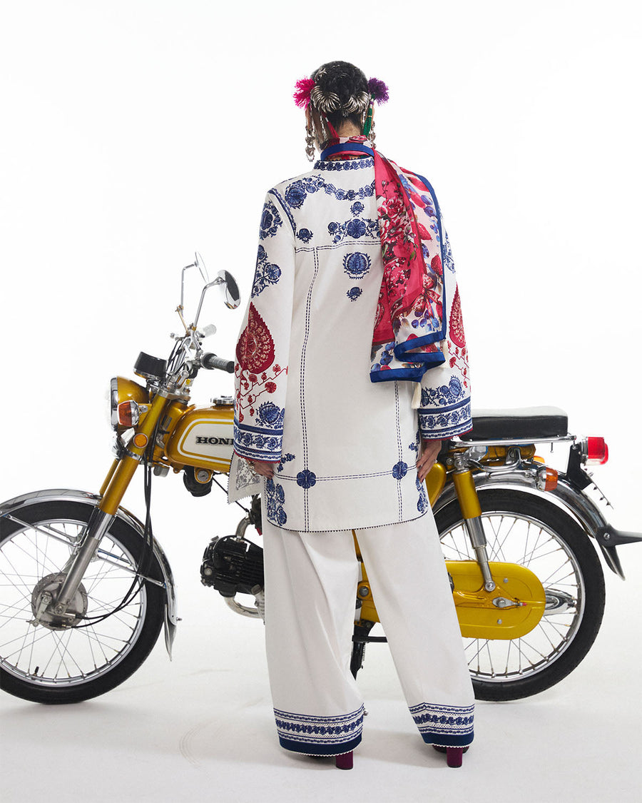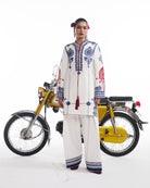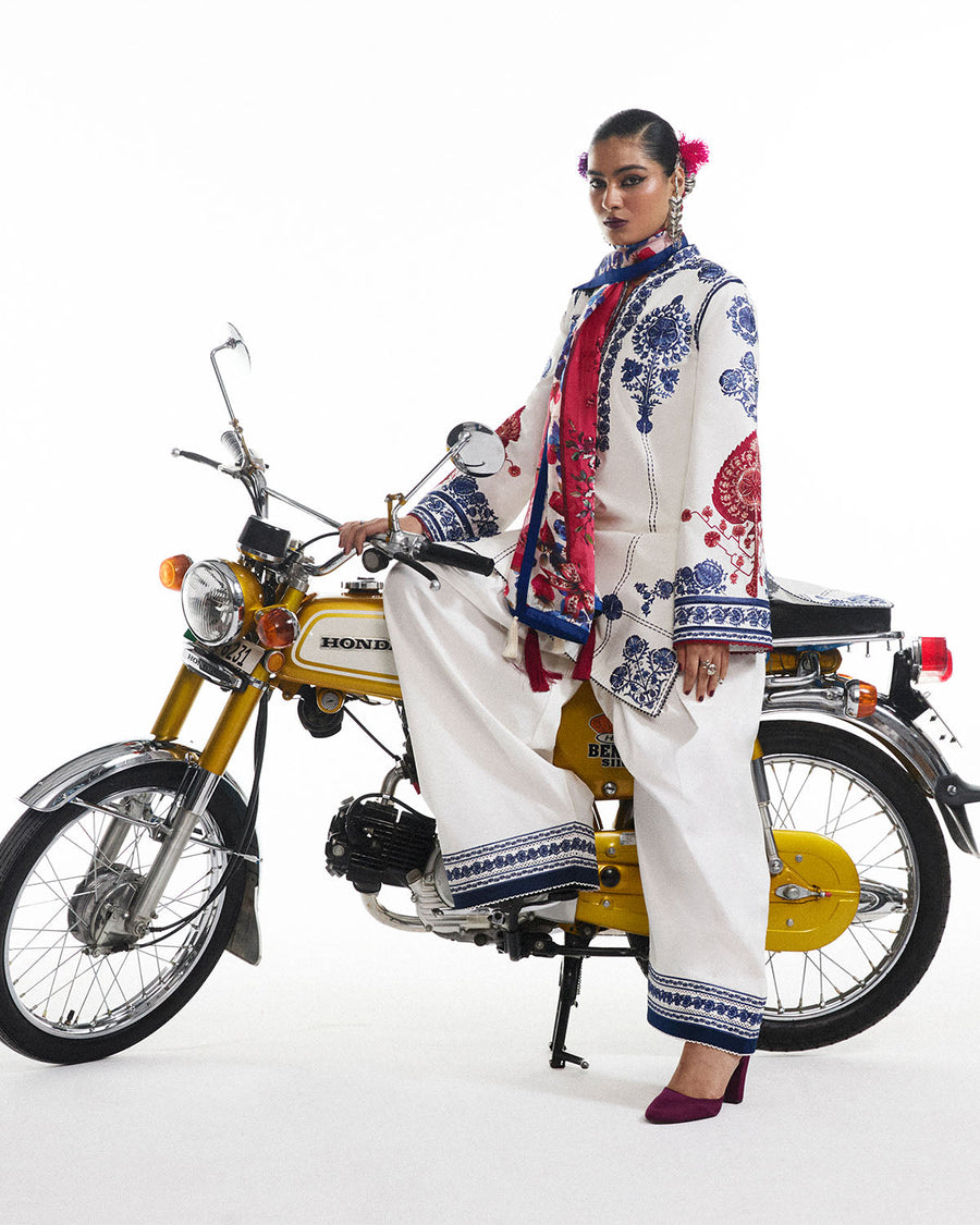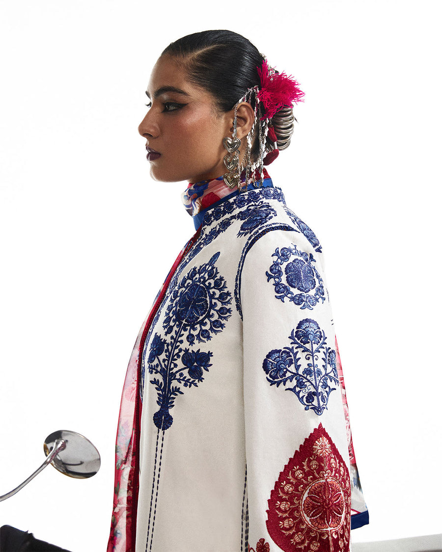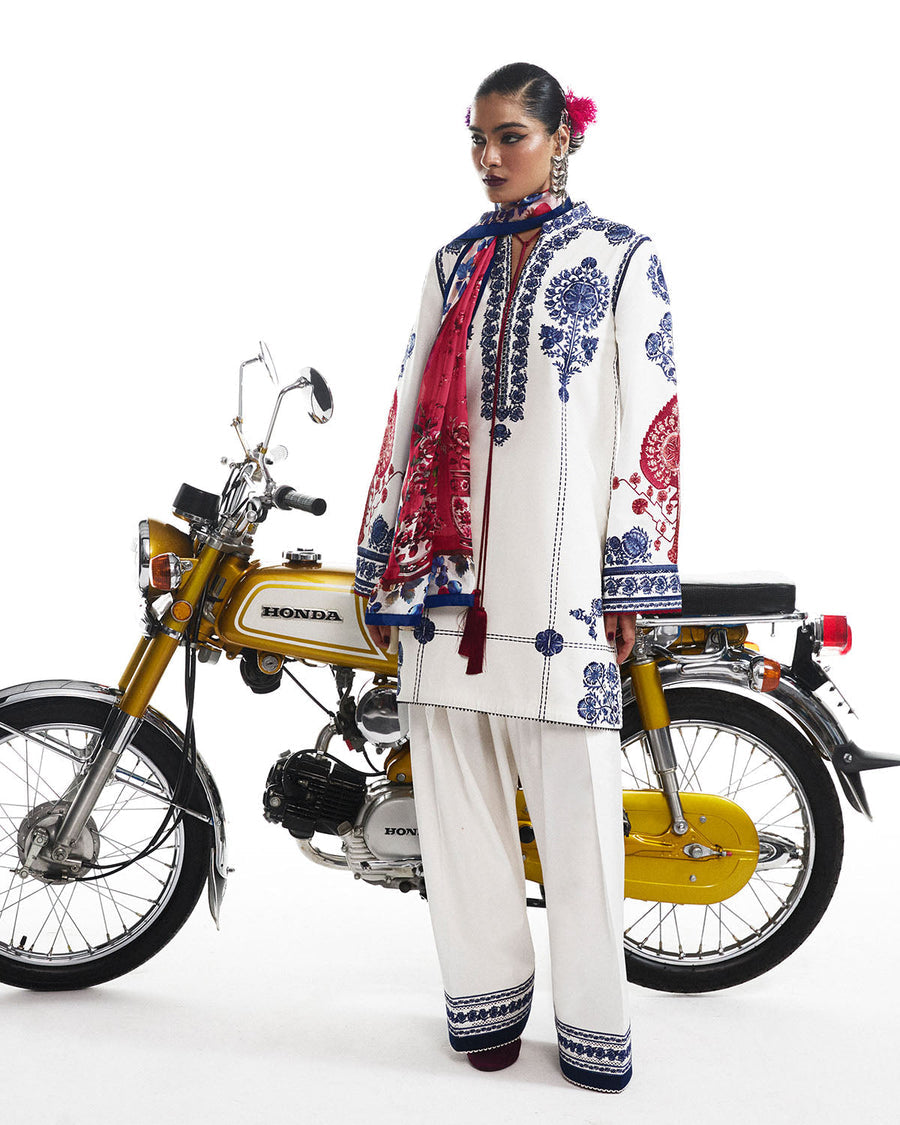 Description: This elegant ensemble features a monochrome embroidered short shirt in a refined ivory tone, adorned with intricate blue threadwork and finished with delicate tassels at the neckline. The bell sleeves are beautifully detailed with matching monochrome embroidery and a striking red accent, adding a bold yet balanced touch. Paired with an ivory shalwar echoing the same embroidery at the hem, the outfit embodies a graceful symmetry. Completing the look is a digitally printed silk scarf, also finished with tassels, that brings a subtle vibrancy and movement, tying together tradition and modernity with effortless charm.