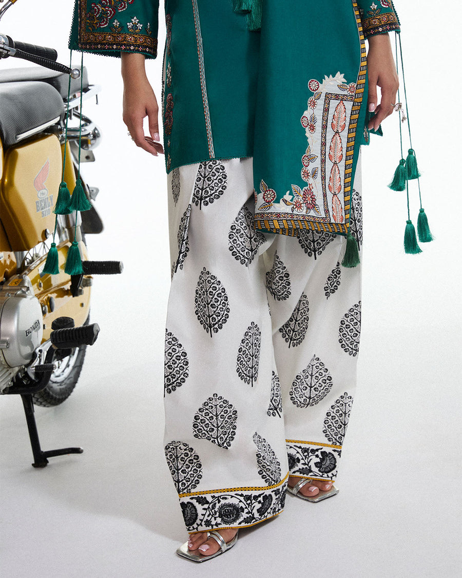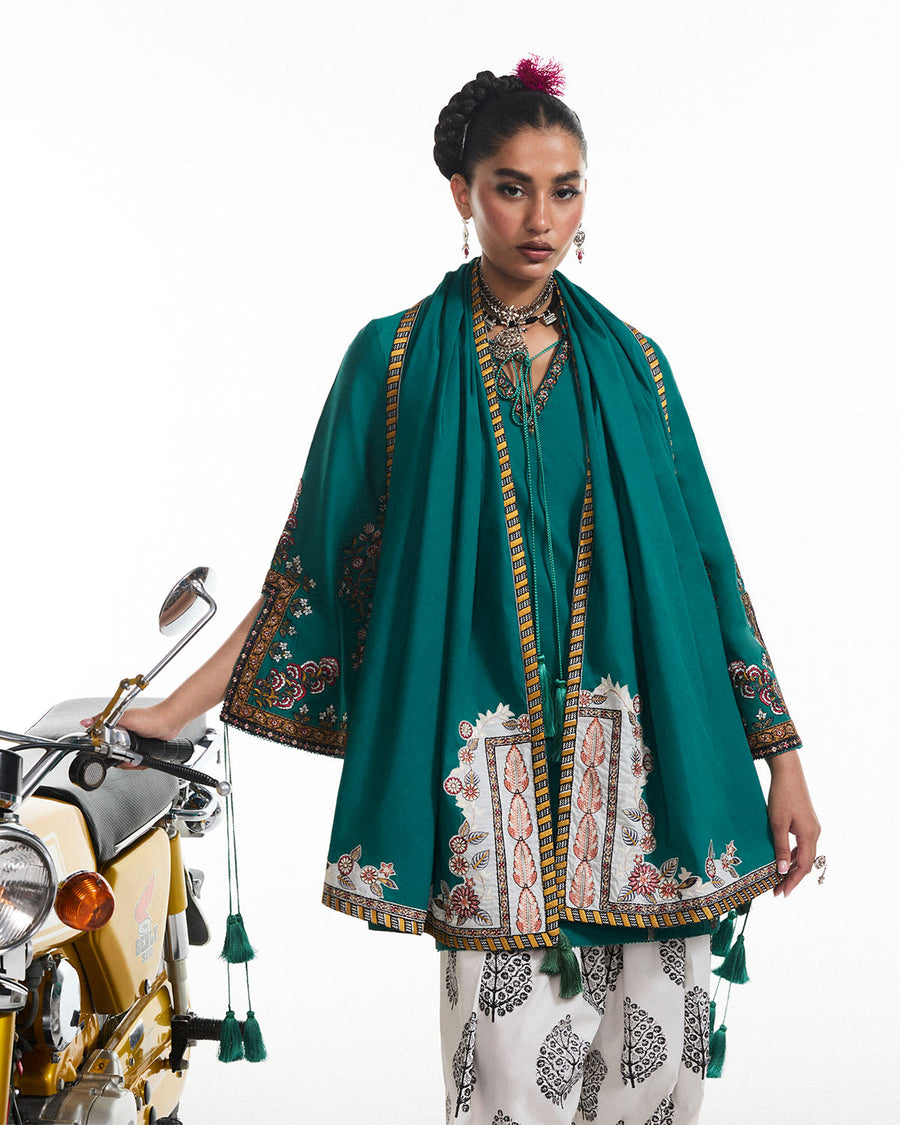 Description: Fusing contemporary style with heritage, this ensemble showcases a teal short shirt richly embellished with multicolor embroidery. The dramatic bell sleeves, embroidered and tipped with tassels, add flair and structure. A screen-printed ivory shalwar, bordered with intricate embroidery, offers refined contrast. Completing the look is a matching embroidered scarf, where tassels and vibrant threadwork reflect a modern twist on timeless tradition.
