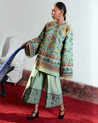 Description: Fresh and spirited, this light green short shirt is covered in multicolor floral embroidery. Bell sleeves carry the same delicate detail, while monochrome dori embroidery on matching culottes brings balance to the vibrant top. A breezy ensemble that moves with ease.