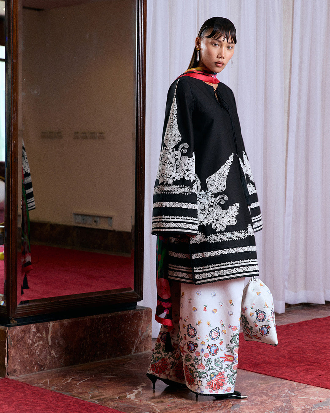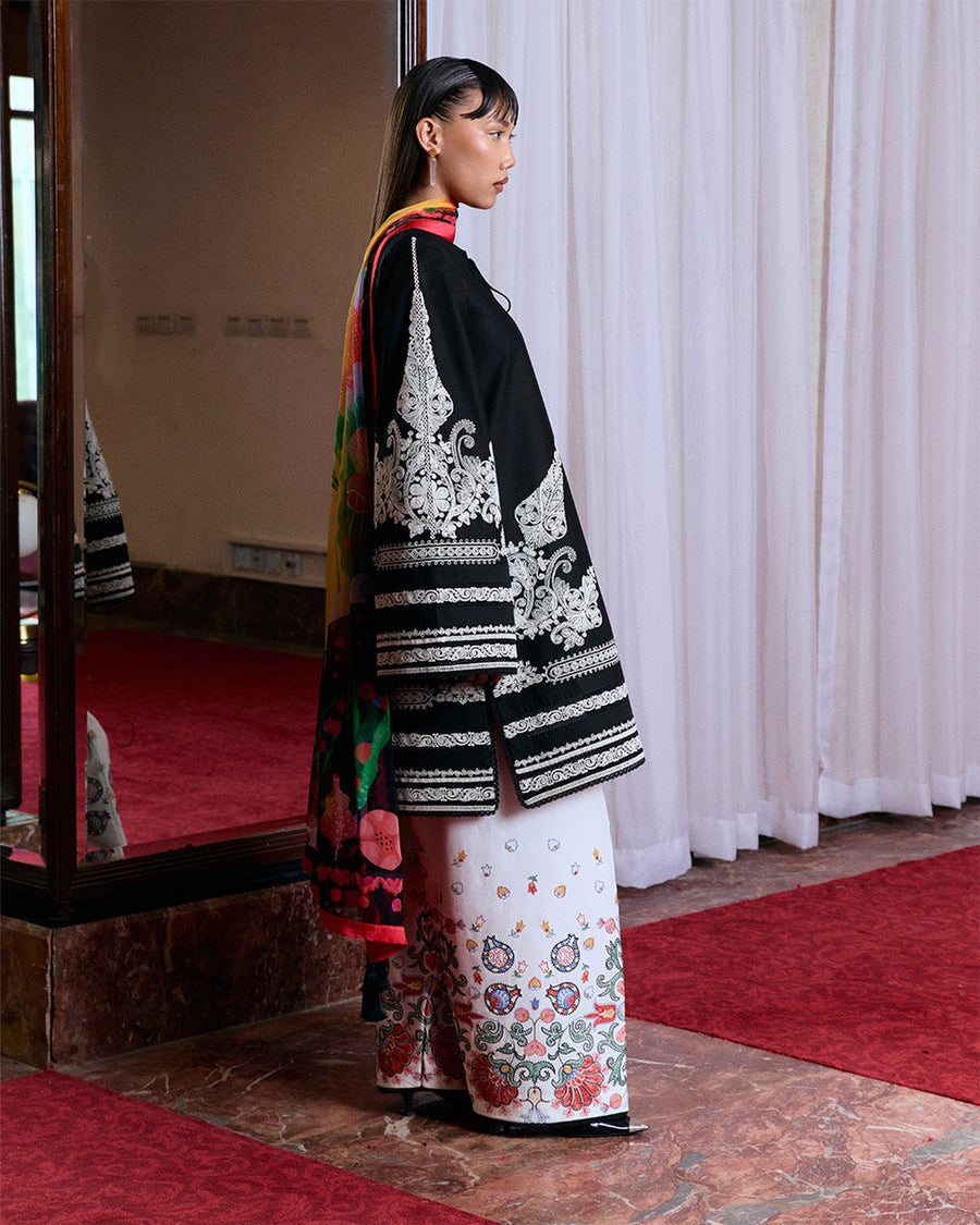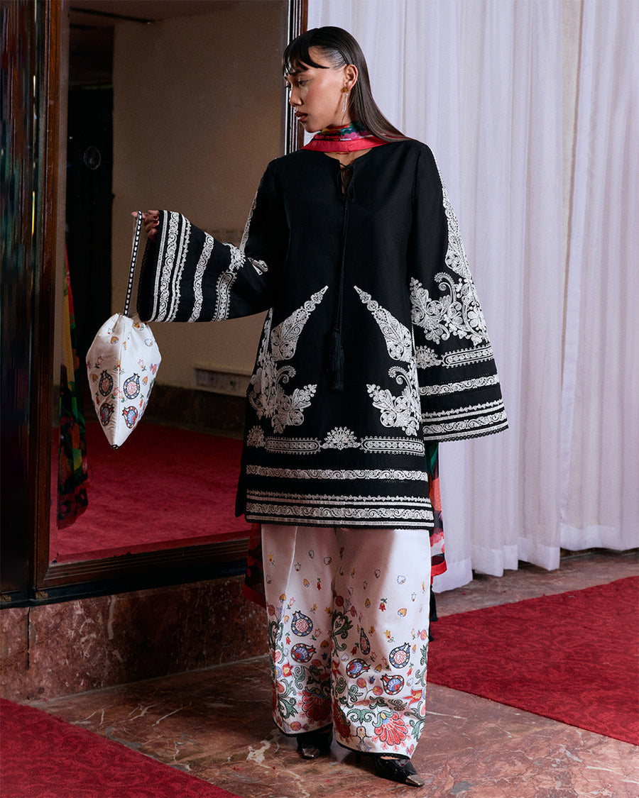 Description: This black shirt is detailed with monochrome dori embroidery and finished with soft tassels for a touch of movement. Bell sleeves echo the same threadwork, while an ivory shalwar featuring multicolor traditional embroidery introduces contrast and craft. A digitally printed chiffon dupatta completes the look with grace and lightness.