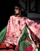Description: A light pink ensemble featuring intricate multicolor floral embroidery, creating a delicate yet striking look. The shirt is adorned with fine detailing and boring embroidery, adding texture and depth. Paired with monochrome pink trousers, featuring subtle embroidery along the hem for a refined finish. The look is brought to life with a vibrant digital-printed silk dupatta, showcasing bold green tones and floral patterns, adding the perfect contrast. A seamless blend of soft hues and intricate craftsmanship.