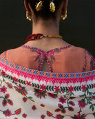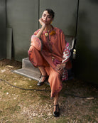 Description: This three-piece ensemble features a terracotta paneled shirt, exquisitely decorated with multicolored cutwork embroidery along the neckline and armhole, adding a vibrant and artistic touch. The round-hem sleeves are adorned with composed embroidery that adds a balanced elegance to the design. Paired with round-hem culottes that mirror the intricate multicolored embroidery, this set is thoughtfully crafted to create a cohesive yet distinctive look. Completing the ensemble is a cream printed wool shawl, adding warmth and a gentle contrast to the terracotta tones. This outfit is a celebration of detailed craftsmanship and refined style, ideal for those seeking a unique blend of tradition and sophistication.
