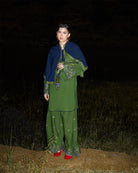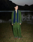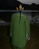 Description: Elevate your wardrobe with this exquisite green ensemble, intricately designed with floral cutwork embroidery for a fresh, elegant look. The shirt features finely crafted floral cutwork throughout, with a touch of charm added by embroidered tassels on the neckline. Straight sleeves continue the cutwork floral theme, creating a cohesive, graceful silhouette. The matching shalwar carries the same floral cutwork embroidery, bringing harmony to the outfit and enhancing its refined appeal. Paired with a contrasting blue scarf, this look is completed with an embroidered floral border and tassels that add a hint of color and movement. Perfect for both special occasions and stylish daytime wear, this ensemble is a beautiful balance of traditional detail and contemporary design.