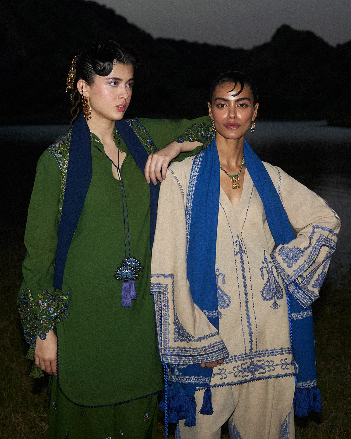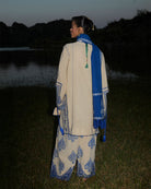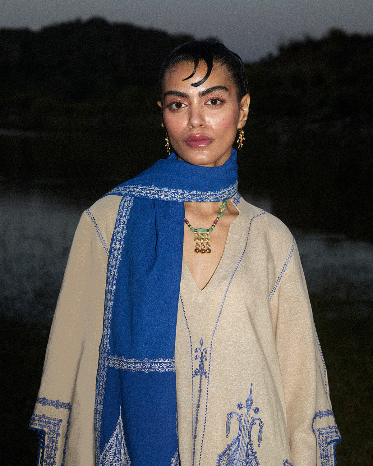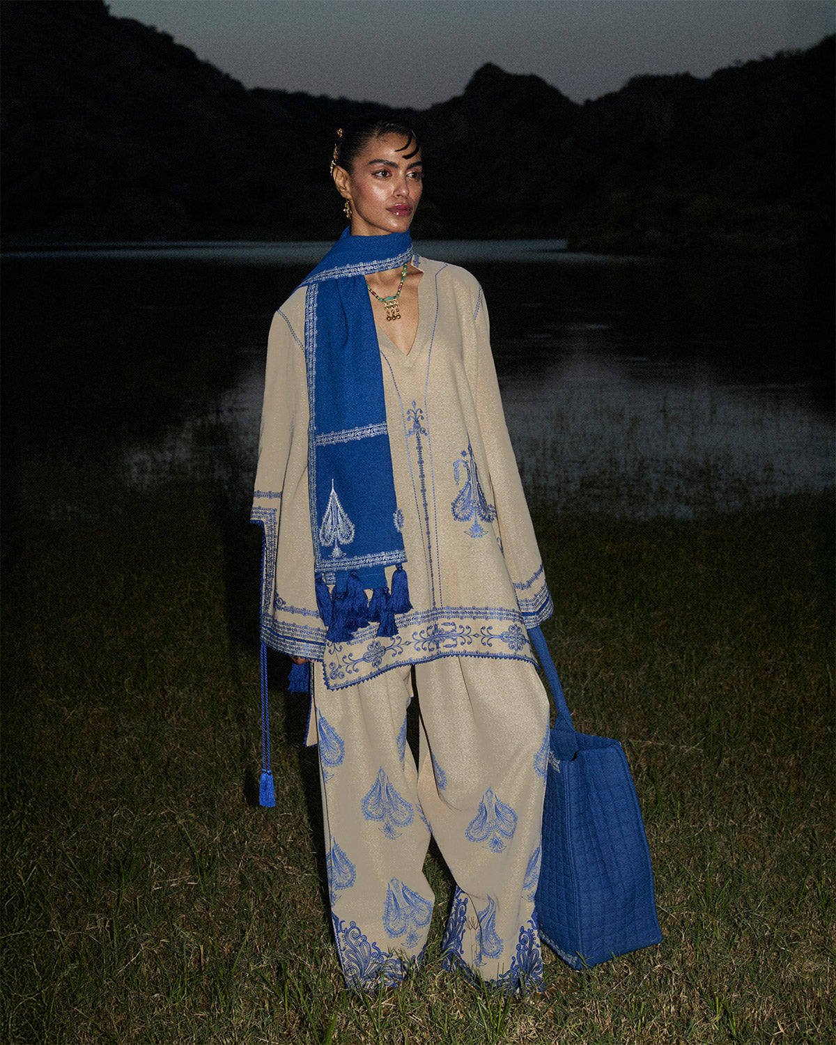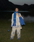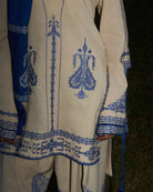 Description: This refined almond-hued ensemble combines intricate monochrome chain stitch embroidery with modern design elements. The short shirt is adorned with delicate chain stitch embroidery, giving it a timeless elegance. The sleeves feature the same monochrome embroidery, enhanced with slits and tassel ties, adding a subtle yet stylish detail to the overall look. The matching almond shalwar is screen-printed and embellished with cutwork embroidery, seamlessly blending pattern with texture. To complete the ensemble, a contrasting blue scarf with monochrome chain stitch embroidery and tassels provides a vibrant accent. This outfit effortlessly balances traditional craftsmanship with contemporary sophistication, perfect for those who appreciate nuanced elegance.