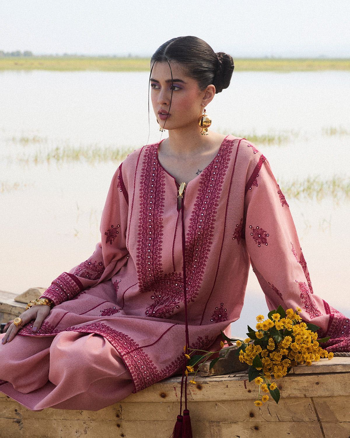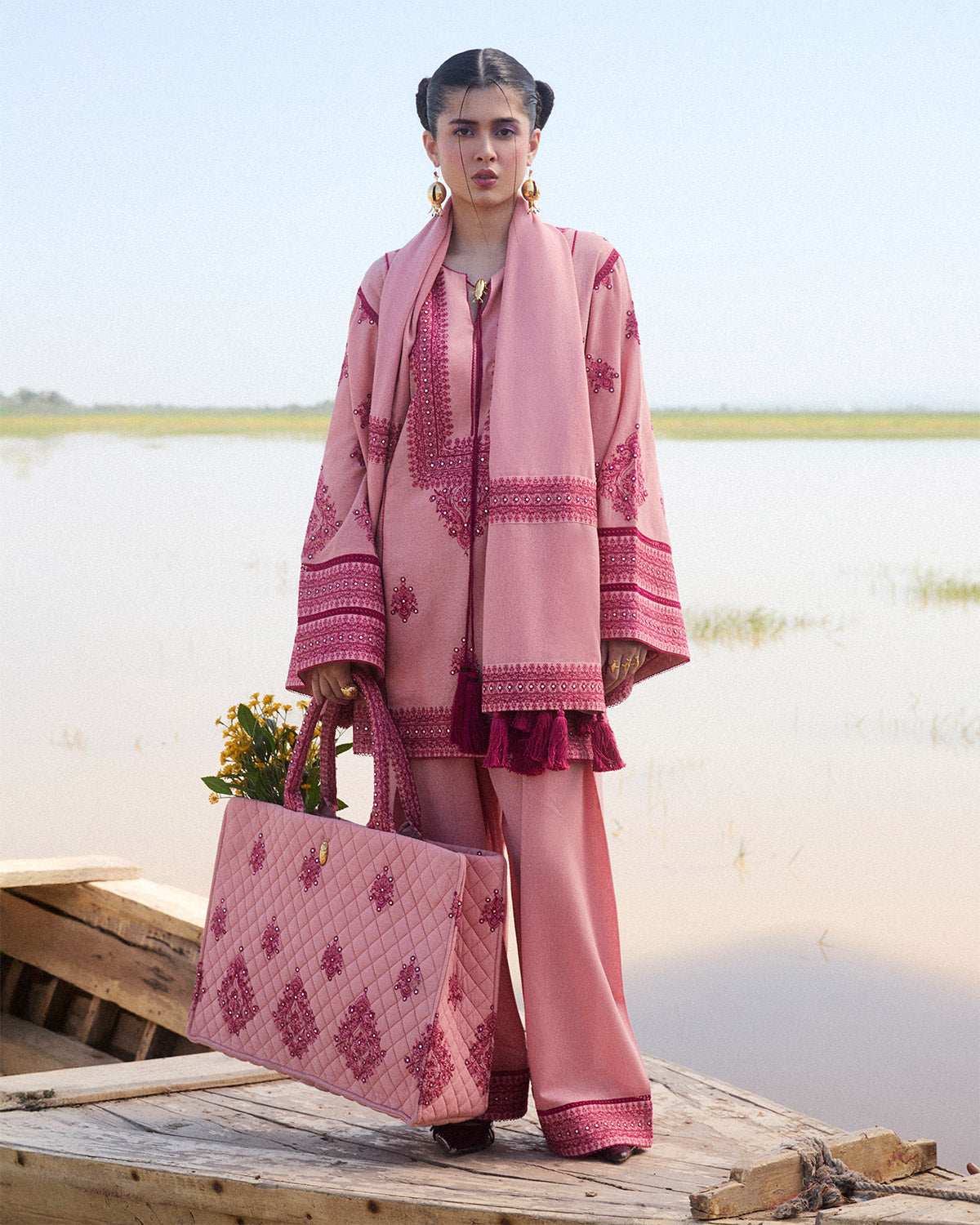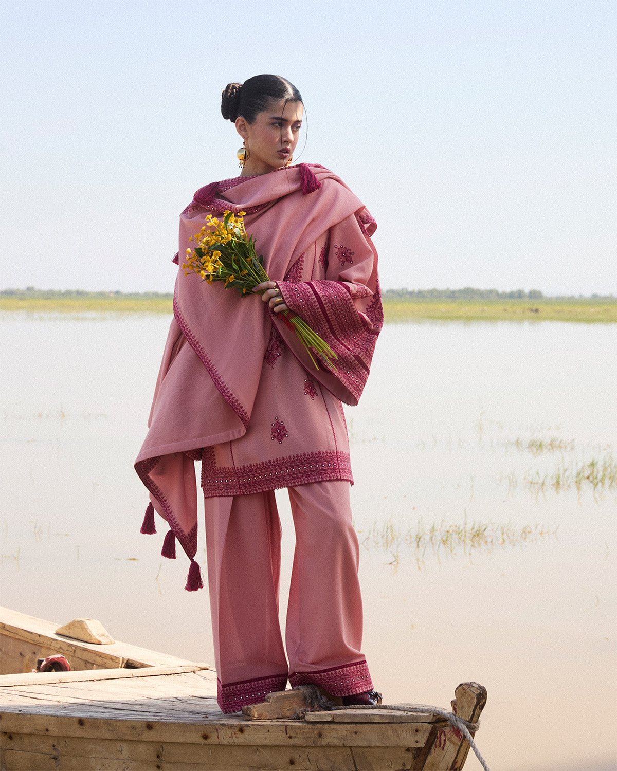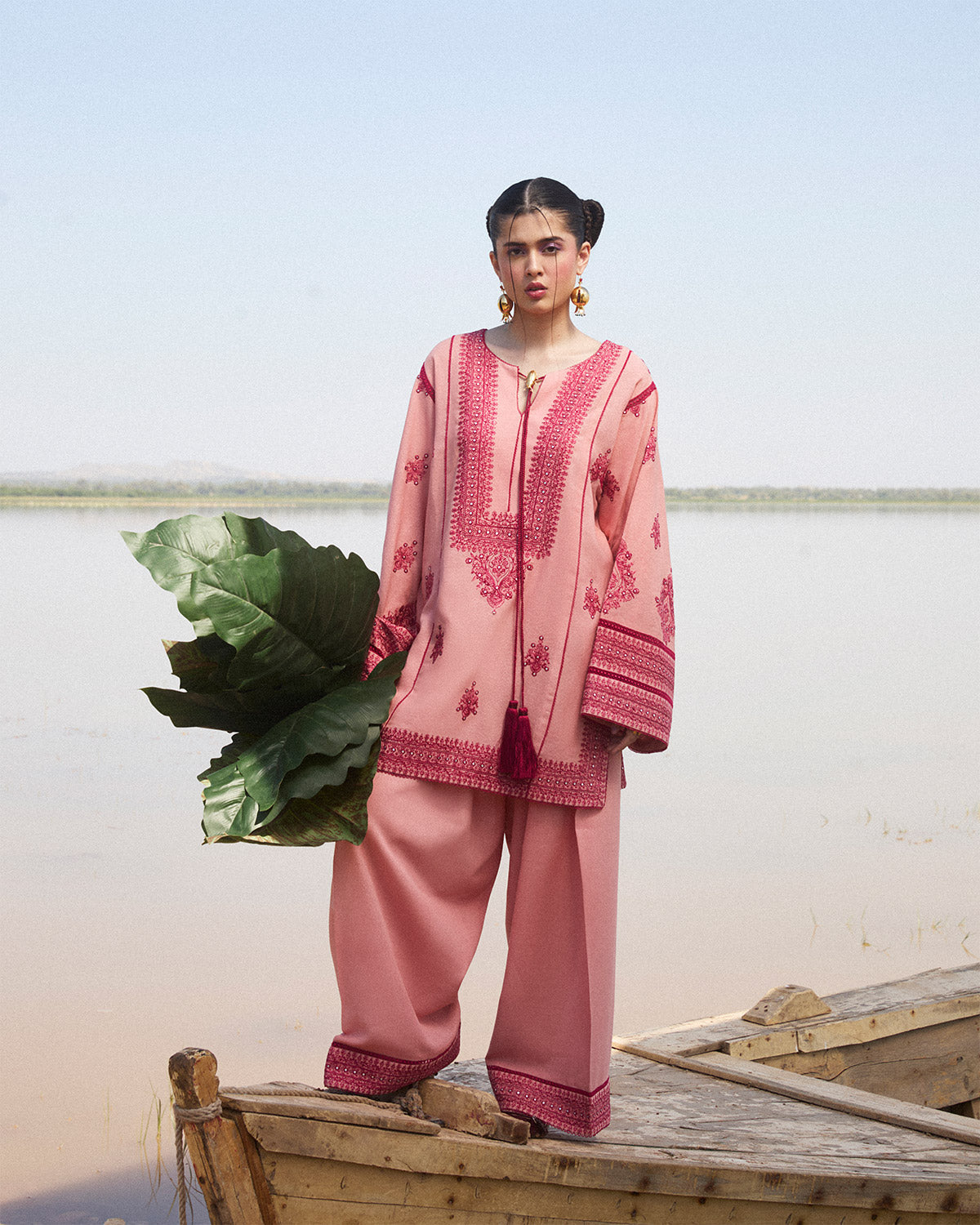 Description: Crafted in a delicate shade of pink, this monochrome ensemble radiates timeless elegance and sophistication. The straight-cut shirt showcases intricate tonal embroidery, thoughtfully placed to enhance its classic silhouette. A charming tassel string ties at the neckline, adding a subtle, playful touch to the refined design. The embroidered bell sleeves feature exquisite lace detailing, adding texture and grace that elevate the overall aesthetic. The matching shalwar is designed with an embroidered border, seamlessly complementing the shirt's intricate details. Completing the set is an embroidered scarf, providing a harmonious finishing touch with its fine detailing that ties together the monochromatic palette. This ensemble is perfect for those seeking understated elegance with a hint of sophistication, making it a versatile choice for both daytime gatherings and evening soirées.